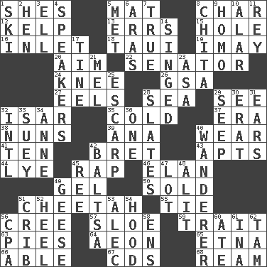 ACROSS 1. "______ My Girl" (Turtles hit) 5. Floor protector 8. Burn to charcoal 12. Seaweed 13. Blunders 15. Hollow 16. An arm off of a larger body of water 18. "Change" in Tahitian 19. "If ____ say so..." 20. Direct toward a target or goal 22. Legislator 24. Leg joint 26. Girls' org. (abbr.) 27. Snakelike fish 28. Ocean 29. Observe 32. Austrian river, tributary to the Danube 35. Having a low temperature 37. Epoch 38. Religious women 39. Santa ___, CA 40. Put on (as clothing) 41. "___ Little Indians" 42. Cy Young winner Saberhagen 43. Flats, for short 44. Sodium hydroxide 45. Hit sharply and swiftly 46. Enthusiasm 49. Set 50. Exchanged or delivered for money 51. Leopard's kin 55. Neckwear 56. Algonquian 57. A type of plum 59. Distinguishing feature 63. Sliced desserts 64. Period of immesurable duration 65. Inactive volcano in Sicily 66. Competent 67. Music discs 68. 480, 500 or 516 sheets of paper DOWN 1. What Jean-Claude Killy likes to do 2. Layer 3. Pipe bend 4. Orators 5. Was introduced to 6. Ancient river in northeast Turkey 7. Loyal 8. Riviera of "Kiss of the Spider Woman" 9. Same (prefix) 10. Having or resembling wings 11. Marina Del _, California 14. Burned superficially 17. Prong on a fork 21. Cartoonist voice _ Blanc 23. White ___ sheet 25. Fortification 28. Chalkboards 29. Ooze 30. Part of Q.E.F. 31. Hearing organs 32. International (abbr.) 33. Chop _ 34. Singer Murray 36. Single 40. Nomad 42. Greek mezzo-soprano Agnes 45. To separate or throw off 47. Car dealer's back yard 48. Came down and settled, as after flight 49. Honkers 51. Baby bed with high sides 52. The bottom of a shoe or boot 53. Actor Baldwin 54. Parka part 56. Tax preparer (abbr.) 58. Followers of ems 60. Had dinner 61. _ tizzy (2 wds.) 62. Scottish cap