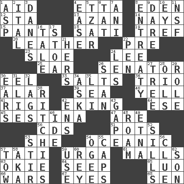 ACROSS 1. Assist 4. Singer James 8. Genesis locale 12. R.R. building 13. Muslim summons to prayer 14. Negative votes 15. Leg coverings 18. Suttee (variant) 19. Not kosher 20. Cordwainer's material 22. Before (prefix) 23. A type of plum 24. Area sheltered from the wind 25. Hearing organ 26. Legislator 30. Snakelike fish 33. Table seasonings 36. Musical group of three 37. Having or resembling wings 39. Ocean 40. Shout 41. Swiss mountan, "Queen of the Mountains" 42. Supplementing with great effort 44. Compass dir. 45. French poetic form 47. "We ___ not amused" (Victoria) 50. Music discs 51. Cooking vessels 53. A female animal or person 54. Pertaining to the sea 57. Jacques of French films 59. Capital and largest city of Mongolia 61. Shopping centers 63. Migrant worker of the '30s 64. Ooze 65. Nilotic language 66. Armed conflicts 67. Snake ____ (dice throw) 68. Elected rep. DOWN 1. Cleo's killer 2. Slanted text style (abbr.) 3. Natives or inhabitants of Denmark 4. Relaxation 5. Russian ruler 6. Make lace 7. Black tropical American cuckoo 8. Plea 9. Have the gumption 10. Sight organ 11. Overdraft (abbr.) 16. Story 17. Portico 21. Possessive pronoun 22. Writing instrument 24. French article 26. Comedian Laurel of Laurel & Hardy 27. Family _ (genealogy) 28. Petroleums 29. Hero or heavy, e.g. 30. Hearing organs 31. Writer Wiesel 32. Fails to keep up a pace 34. "____ silly question..." 35. Flowery wreath 38. Actors Guy, Robert Welles, and Clint 42. Followers of ems 43. Yawn 46. Binary compound 48. Wander aimlessly 49. Inactive volcano in Sicily 52. Beverly of Met fame 53. Agitate 54. Double curve, resembling the letter S 55. Smile enhancers 56. A slight indication 57. Pull behind 58. Alias (abbr.) 59. Purpose 60. Marina Del _, California 62. Male child