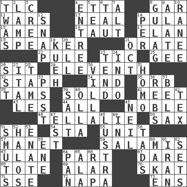 ACROSS 1. Affectionate concern, for short 4. Singer James 8. Slender fish 11. Armed conflicts 13. Actress Patricia 14. Monetary unit of Botswana 15. So be it 16. Pulled tight 17. Liveliness 18. Orator 21. Declaim 22. Whine 23. Nervous spasm 25. Turn to the right 26. Be seated 29. Veterans Day date 32. Staphylococcus 34. Indiana (abbr.) 35. Globe 38. Scottish caps 39. Twentieth part of a lira 41. Confront 43. French article 44. Everything 45. Impressive in appearance 46. Copy Pinocchio 50. Saxophone 51. A female animal or person 54. R.R. building 55. A single undivided whole 57. French painter Edouard 59. Deli grouping 63. Uhlan (variant) 64. Component 67. Have the gumption 68. Lug 69. Having or resembling wings 70. Three-handed card game 71. Compass dir. 72. California wine valley 73. Followers of ems DOWN 1. It was, poetically 2. Desk light 3. Algonquian 4. Main course 5. Beverage made from leaves 6. The 19th letter of the Greek alphabet 7. Keyboard modifier key 8. POW camp 9. Having winglike extensions 10. Indian princess (variant) 12. Fastener 14. For each 19. Malaysian steamed pastry 20. Pipe bend 21. Sep. follower 23. Be inclined (to) 24. _ china 26. Fast jet (abbr.) 27. Slanted text style (abbr.) 28. Not wild 30. Country estate 31. Like (prefix) 33. Inconspicuous attention getter 36. Confederate soldiers (slang) 37. Actor Lugosi 39. Table seasoning 40. Rounded earthenware pot or jar 42. John Ritter's dad 45. Famous astronaut Armstrong 47. Eastern Standard Time (abbr.) 48. A period of five years 49. _ tizzy (2 wds.) 51. Particles of soot 52. Rings 53. Related on the mother's side 56. Bits 58. Compass dir. 60. Cause to be 61. SW Asia republic 62. Puts into a specified state 64. Baking dish 65. Insect wing 66. Strike