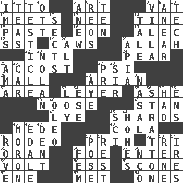 ACROSS 1. "Tell ____ the Marines!" 5. Tate display 8. Large container 11. Confronts 13. Born 14. Prong on a fork 15. Thick mixture 16. A really long time 17. Actor Baldwin 18. Fast jet (abbr.) 19. Crow sounds 21. Assad's deity 22. International (abbr.) 24. Lightbulb-shaped fruit 25. Buttonhole 27. 23rd letter of the Greek alphabet 29. Promenade 30. Believer in; advocate of (suffix) 32. Type of rug 33. Prying instrument 35. American tennis player Robert 39. Trap for birds or small mammals 41. Comedian Laurel of Laurel & Hardy 42. Sodium hydroxide 43. Pottery fragments 45. Ancient Persian 48. Root beer relative 49. Cowboy competition 50. Demure 52. Three (prefix) 55. NW Algerian seaport 56. Enemy 57. Keyboard key 59. Electrical Unit 60. Double-curved letter 61. Biscuitlike quick bread 62. Compass dir. 63. Was introduced to 64. Singles DOWN 1. Naughty children 2. Afternoon social gatherings 3. A testis 4. Baseball player Mel 5. Afresh 6. Vintage cars 7. "___ Little Indians" 8. Country estate 9. Approach 10. Georgia ____ (Atlanta school) 12. Religious groups 14. Lie 20. Keyboard modifier key 21. Capital of Western Samoa 23. Pitcher Ryan 25. Housemaid (var.) 26. Auto 27. Before (prefix) 28. Title for a knight 30. "___ Maria" 31. Rhinal 33. Myrna of the movies 34. Compass dir. 36. Ski resort town in Vermont 37. Possessed 38. Followers of ems 40. Margarine 43. _-fi 44. Residences 45. Person of subnormal intelligence 46. Peak District village in England 47. Gouge 49. Be footloose 50. Introduce or present, as a question 51. Respite 53. French philosopher Descartes 54. Angers 56. Opposite of masc. 58. Non-commissioned officer (abbr.)