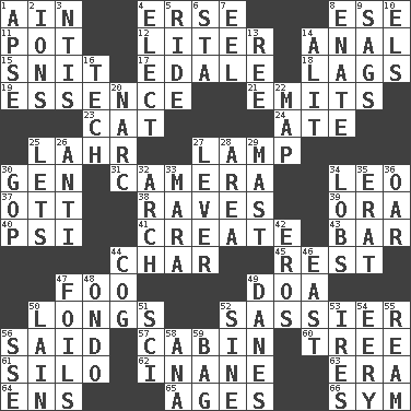 ACROSS 1. The 18th letter of the Arabic alphabet 4. Celtic language 8. Compass dir. 11. Cooking vessel 12. 61 cubic inches 14. Of or related to the anus 15. In a ____ (agitated or irritated) 17. Peak District village in England 18. Fails to keep up a pace 19. Center 21. Gives off 23. Feline 24. Had dinner 25. Cowardly lion portrayer 27. Desk light 30. Commissioned mil. rank 31. Device for capturing images 34. Lion 37. Baseball player Mel 38. All-night dance parties 39. Mouth or opening 40. Air pressure measure (abbr.) 41. Cause to be 43. Oblong piece of solid material 44. Burn to charcoal 45. Remainder 47. Egg _ yung 49. ___ good deed 50. Yearns 52. More impudent 56. Stated 57. Small house or cottage 60. Woody plant 61. Grain storage tower 62. Silly 63. Epoch 64. Followers of ems 65. Matures 66. Symbol (abbr.) DOWN 1. Domed church section 2. Charged atoms 3. Nuclear Threat Initiatives 4. Choose 5. Travel on an animal 6. R.R. building 7. Snakelike fish 8. Related on the mother's side 9. Settles 10. Raised railways 13. To sift 14. Set down 16. Technical work 20. Drug cop 22. Atlas unit 25. Allows 26. Against 27. Prying instrument 28. Type of rug 29. Vertical spar for supporting sails 30. Republican Party 32. Bowlike part 33. Hindu Mythology: god of death 34. Tennis shots 35. Part of Q.E.F. 36. Rowing implement 42. Greek god of love 44. Gear tooth 46. 90 degrees 47. Fencing necessities 48. Southwest Nigerian state 49. Natives or inhabitants of Denmark 50. (Had) reclined 51. _-fi 52. Trig term 53. Angers 54. Suggestive of the supernatural 55. 480, 500 or 516 sheets of paper 56. Compass dir. 58. Santa ___, CA 59. Paper or plastic container
