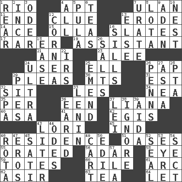 ACROSS 1. River (Sp.) 4. Fitting 7. Uhlan (variant) 11. Conclusion 12. A slight indication 13. Eat (away) 14. Adept person 15. Water jar 16. Chalkboards 17. More valued for its uncommonness 19. Aide 21. Cuckoo 23. Toward shelter 24. One who uses or employs something 25. Pipe bend 26. Infant food 29. Entreaties 30. Mountains (abbr.) 31. Eastern Standard Time (abbr.) 32. Be seated 33. French article 34. Teachers' org. 35. For each 36. Car or cant ending 37. Woody, climbing, usually tropical plant 40. White ___ sheet 41. Added to 42. Armor plate that protects the chest 43. Australian parrot (variant) 45. Indiana (abbr.) 46. Dwelling 51. Fertile tracts in a desert 55. Spoke pompously 56. The sixth month of the Jewish calendar 58. Sight organ 59. Lugs 60. Cause heat under the collar 61. Curve 62. SW Saudi Arabia district 63. Afternoon social gathering 64. Allow DOWN 1. Located in or toward the back 2. South American Indian 3. Baltic tributary 4. Everything 5. Monetary unit of Botswana 6. Afternoon social gatherings 7. A salt of uric acid 8. Globular water bottle used in Asia 9. An important port of Yemen 10. A home for chicks 12. Pupil covering 13. Otherwise 16. Beverly of Met fame 18. Relaxation 20. Table seasonings 22. Big collection agency 24. Extremist 25. Make improvements or corrections to 26. Actor Sean's family 27. At sea 28. Parent Teacher Assoc. 29. Sliced desserts 32. Health resort 33. Soviet premier 1918-24 36. Having ears or earlike features 37. Luau accessory 38. Refuse to acknowledge 39. Opera by Verdi 43. 61 cubic inches 44. Lyric poems 46. Round or rotation of duties 47. Greek god of love 48. Suttee (variant) 49. Draw slowly or heavily 50. Singer Brickell 52. Lick closed 53. Jane of fiction 54. Religious group 57. Insect wing