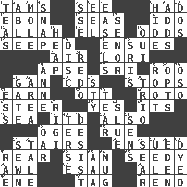 ACROSS 1. Scottish caps 5. Observe 8. Possessed 11. Inky black, to poets 12. Oceans 14. Wedding promise 15. Assad's deity 17. Otherwise 18. Probability 19. Oozed 21. Follows as a consequence or result 23. Atmosphere 25. Australian parrot (variant) 26. Domed church section 27. _ Lanka 28. Friend of Pooh 31. Separate the seeds from cotton 33. Music discs 35. Ceases 37. Merit 38. Baseball player Mel 40. Printing process, for short 41. Guide 43. It is so 45. ___ a Wonderful Life 46. Ocean 47. It would 50. In addition 52. Double curve, resembling the letter S 53. Regret 54. Flight of steps 56. Followed as a consequence or result 61. Buttocks 62. Thailand, formerly 65. Shabby and untidy 66. Leather borer 67. He sold his birthright 68. Toward shelter 69. Compass dir. 70. Label 71. Tear apart DOWN 1. Beverages made from leaves 2. Competent 3. Undercover agent 4. Fastener 5. Compass dir. 6. Snakelike fish 7. Artist's stands 8. Flintstone garb 9. Does sums 10. Two (Sp.) 13. Sir (Sp.) 16. Pile 18. Fr. "Yes" 20. Flat circle 22. Indian titles of respect 24. Redecorate 26. Singer Murray 28. Carrot, for example 29. Elects 30. Bear (Spanish) 31. Yard entry 32. Type of rug 34. Filthy place 36. Musical group of three 37. Double-curved letter 39. Pull into pieces 42. Swiss mountan, "Queen of the Mountains" 44. Turn sharply 48. Laconic 49. Cease 51. Elected reps. 52. Boat paddle 54. Stitched 55. Falsehood 57. Scorch 58. Ubangi River tributary 59. Locale of original sin 60. Colored 61. Actress Charlotte 63. American Automobile Association (abbr.) 64. Java container
