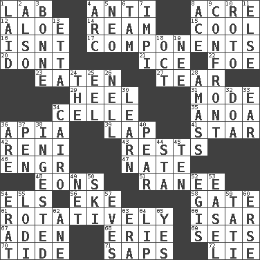 ACROSS 1. Experiment locale 4. Against 8. 1/640 square mile 12. _ vera 14. 480, 500 or 516 sheets of paper 15. Calm and collected 16. Is not 17. Parts 20. Do not 21. Frozen water 22. Enemy 23. Ingested 27. Pull into pieces 29. Person who is morally reprehensible 31. Method 34. Cell (Danish) 35. Small Philippine buffalo 36. Capital of Western Samoa 39. Infant locale 41. Play the lead 42. Painter Guido (1575-1642) 43. Musical pauses 46. Engineer (abbr.) 47. Nathan's nickname 48. Immeasurably long periods of time 51. Indian princess (variant) 54. Raised railways 56. Supplement with great effort 58. Yard entry 61. Rotating or pertaining to rotation 66. Austrian river, tributary to the Danube 67. Arabian gulf 68. One of the Great Lakes 69. Puts into a specified state 70. Event that recurs at intervals 71. Plant excrements 72. Falsehood DOWN 1. Put down 2. In addition 3. Child's nurse 4. Curve 5. Modern: prefix 6. Scottish cap 7. Body of Kaffir warriors 8. Adept person 9. Meet 10. Printing process, for short 11. Otherwise 13. Singer James 18. Sep. follower 19. Born 24. Definite Article 25. Snakelike fish 26. 1994 drama film starring Jodie Foster 28. Collect or gather 30. Acquire or gain knowledge or skills 32. ___ good deed 33. Hearing organ 34. Capital of Egypt 36. "We ___ not amused" (Victoria) 37. Fenced enclosure 38. Eaten 40. Lightbulb-shaped fruit 44. R.R. building 45. Nine, plus one 49. Fish or hair follower 50. What Jean-Claude Killy likes to do 52. The front part of a cuirass 53. Artist's stand 54. Part of Q.E.F. 55. Farming town in central California 57. Nights before holidays 59. Jacques of French films 60. Celtic language 62. One (Scot) 63. Period 64. Mouth edge 65. It is so