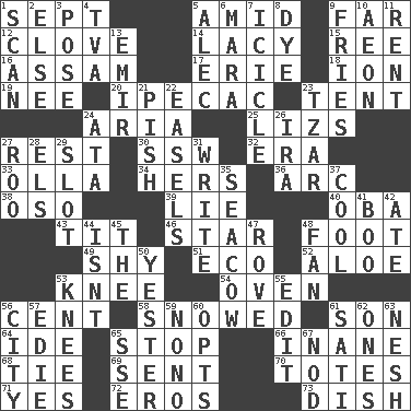 ACROSS 1. Back-to-school mo. 5. Among 9. Distant 12. Garlic unit 14. Made of lace 15. Portuguese money of account (variant) 16. Indian state 17. 4th largest of the Great Lakes 18. Electrically charged atom 19. Born 20. Medicinal drug used to evoke vomiting 23. Portable shelter 24. Operatic vocal solo 25. Belonging to Elizabeth 27. Remainder 30. Compass dir. 32. Period 33. Water jar 34. Possessive pronoun 36. Curve 38. Bear (Spanish) 39. Falsehood 40. Chief or king in Benin or Nigeria 43. Teat (slang) 46. Play the lead 48. 12 inches 49. Like a shrinking violet 51. Environmental prefix 52. _ vera 53. Leg joint 54. Baking chamber 56. Penny 58. Frozen precipiation fell 61. Manchild 64. Binary compound 65. Obstruct or block passage 66. Lacking in sense or substance 68. Standoff 69. Posted 70. Lugs 71. It is so 72. Greek god of love 73. Food container DOWN 1. Glance over 2. Otherwise 3. Introduce or present, as a question 4. Federal power corp. 5. Actor Baldwin 6. Hindu Mythology: god of death 7. Ice on the eave 8. Color 9. Strips of potato fried in deep fat 10. A really long time 11. Monthly bill 13. Independent ruler or chieftain 21. Expression of disdain 22. Artist's stands 23. Russian ruler 24. _ moment's notice (2 wds.) 26. Retirement account (abbr.) 27. Friend of Pooh 28. Raised railways 29. Narrow, elongated depression 31. Compose 35. Manatee 37. Calm and collected 41. Sometimes accompanies a hiss 42. Had dinner 44. Is not 45. Definite Article 47. Be footloose 48. Air blower 50. Last past 53. Leg joints 55. Prepare for publication 56. Municipality 57. Singer Brickell 59. Words to Nanette 60. Elects 61. Suttee (variant) 62. Singles 63. Soft 65. Compass dir. 67. Allow head to fall sleepily