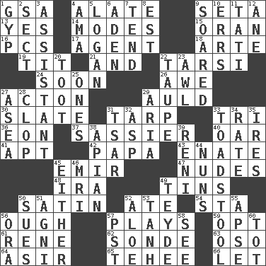ACROSS 1. Girls' org. (abbr.) 4. Having winglike extensions 9. Bristle 13. Affirmative reply 14. Methods 15. Northwest Algerian city 16. Personal Computers (abbr.) 17. Rep 18. Johnson of "Laugh-In" 19. Teat (slang) 21. Added to 22. Tarsus (plural) 24. Within a short period 26. Deep reverence 27. Gambison 29. Old (Scot.) 30. Schedule 31. Canvas cover 33. Three (prefix) 36. Age 37. More impudent 40. Rowing implement 41. Fitting 42. Dad 43. Related on the mother's side 45. Arab leader 47. Unadorned figures 48. Retirement account (abbr.) 49. Metal containers 50. Smooth fabric 52. Had dinner 54. R.R. building 56. Ending for "Through" and "Enough" 57. Romps 59. Elect 61. French philosopher Descartes 62. Message 63. Bear (Spanish) 64. SW Saudi Arabia district 65. Giggle 66. Allow DOWN 1. Con 2. Religious group 3. Aide 4. Wet nurse (var.) 5. Utah city north of Ogden 6. Arabian gulf 7. Watch over 8. Eastern Standard Time (abbr.) 9. Flew 10. Blunders 11. Jacques of French films 12. A saturated hydrocarbon 20. A blast of a horn 22. Grayish beige 23. Leather borer 25. Singles 27. At sea 28. Hoof sound 29. Operatic vocal solo 31. Russian ruler of old 32. Cleo's killer 33. Inedible or poisonous agaric 34. Assign a rank or rating to 35. Angers 38. Bee-related 39. Painter Guido (1575-1642) 44. Religious women 45. One or the other of two 46. Medical imaging device (abbr.) 49. Miss Universe 1986, Barbara Palacios _ 50. Takes to court 51. Hindu god of fire 52. _ vera 53. Hyperbolic tangent 55. Domed church section 56. Mouth or opening 57. Pacific Standard Time (abbr.) 58. Perceive with the eye 60. Small child