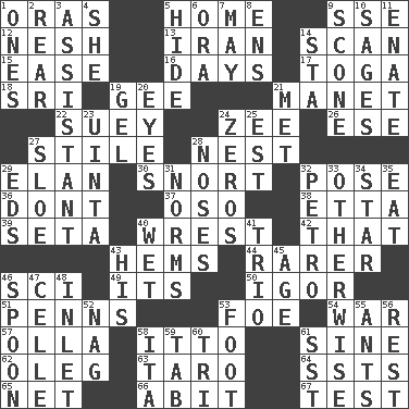 ACROSS 1. Mouths or openings 5. Dwelling 9. Compass dir. 12. Soft 13. SW Asia republic 14. Examine hastily 15. Relaxation 16. 24-hour periods 17. Ancient Roman robe 18. _ Lanka 19. Unit of force equal to gravity 21. French painter Edouard 22. Chop _ 24. Last letter of the English alphabet 26. Compass dir. 27. Vertical member of a panel or frame 28. A home for chicks 29. Flair 30. Derisive sound 32. Airs 36. Do not 37. Bear (Spanish) 38. Singer James 39. Stalk of a moss capsule 40. Obtain by seizing forcibly or violently 42. Not this but _ 43. Folds over and sews together 44. Less widely known 46. _-fi 49. ___ a Wonderful Life 50. Russian composer Stravinsky 51. Actor Sean's family 53. Enemy 54. Armed conflict 57. Spanish pot 58. "Tell ____ the Marines!" 61. Trig term 62. Cassini of fashion 63. Edible starchy tuberous root 64. Fast planes 65. Fish or hair follower 66. "This won't hurt ____!" 67. Trial DOWN 1. Washington bills 2. Hitchcock's "____ Window" 3. Helper 4. A female animal or person 5. Flintstone garb 6. Mouth or opening 7. Can I? 8. Followers of ems 9. Biscuitlike quick bread 10. Gurus 11. Maternal 14. R.R. building 19. Set 20. Snake ____ (dice throw) 21. Was introduced to 23. National forest in Provo, Utah 24. Nothings 25. Eastern Standard Time (abbr.) 27. A type of plum 28. Olfactory organs 29. Begley and Asner 31. Typical standards 32. Stone: prefix 33. Else 34. Play the lead 35. Consume 40. Soggy 41. Musical group of three 43. Part of HMS, perhaps 45. Grow older 46. Soup utensil 47. Cell (Danish) 48. An arm off of a larger body of water 52. Tired old horse 53. One third of a yard 55. Pismires 56. Repose 58. Call ___ day 59. Keyboard key 60. Three (prefix) 61. Fast jet (abbr.)