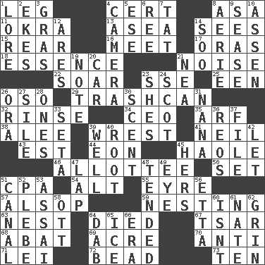 ACROSS 1. Part of a journey 4. Sure thing 8. White ___ sheet 11. Gumbo ingredient 13. At sea 14. Perceives with the eye 15. Stern 16. Confront 17. Mouths or openings 18. Gist 21. Annoying sound 22. Fly high 23. Compass dir. 25. Car or cant ending 26. Bear (Spanish) 29. File 13 32. Wash lightly 34. Corporate head (abbr.) 35. Sandy's bark 38. Toward shelter 39. Take or capture by force 41. Famous astronaut Armstrong 43. Eastern Standard Time (abbr.) 44. Period of immesurable duration 45. White Person, in Hawaii 46. One to whom something is allotted 50. Arrange properly for use 51. Accounting whiz (abbr.) 54. The first octave above the treble staff 55. Jane of fiction 57. Columnist Joseph or Stewart 59. Nestling 63. A home for chicks 64. Passed on 67. Russian ruler of old 68. Blind as ____ 69. Measure of real estate 70. Opposed to 71. Luau accessory 72. Necklace unit 73. Nine, plus one DOWN 1. Old wives' tales, e.g. 2. Supplements with great effort 3. Pate de foie ____ 4. Device for capturing images 5. Compass dir. 6. Portuguese money of account (variant) 7. Make lace 8. Nest on high 9. Gospel singer Marvin 10. NE Netherlands city 12. Ancient Greek god of war 14. "Barney Miller" actor Jack 19. Brief written record 20. Auto 21. Teachers' org. 23. "______ My Girl" (Turtles hit) 24. Native of Scotland 26. Mouth or opening 27. Drop; flow; fall 28. Singles 30. Aroma 31. Grandmother 33. Stalk of a moss capsule 36. Vintage cars 37. Do some clerical work 39. Water source 40. Carrot, for example 42. Allow 45. Possessive pronoun 47. Infant locale 48. Watched over 49. Sight organ 51. Lessep's creation 52. First-year military academy student 53. Slender Brazilian palm 56. Singer James 58. Baseball player Mel 60. Is not 61. Nathan's nickname 62. Smile widely 64. Pat or tap gently 65. Frozen water 66. Period