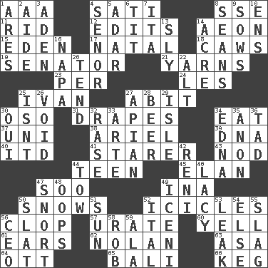 ACROSS 1. American Automobile Association (abbr.) 4. Suttee (variant) 8. Compass dir. 11. To free from 12. Proofreads 14. Age 15. Locale of original sin 17. Brizilian seaport 18. Crow sounds 19. Legislator 21. Tall tales 23. For each 24. French article 25. _ the terrible 27. "This won't hurt ____!" 30. Bear (Spanish) 31. Window treatments 34. Ingest 37. Corn or form start 38. Satellite of Uranus 39. Heredity factor (abbr.) 40. It would 41. A viewer who gazes fixedly 43. Dreamland 44. Adolescent 45. Liveliness 47. "Barney Miller" actor Jack 49. _ tizzy (2 wds.) 50. Overwhelms 52. Winter's stalactites 56. Hoof sound 57. A salt of uric acid 60. Shout 61. Hearing organs 62. Pitcher Ryan 63. White ___ sheet 64. Baseball player Mel 65. Indonesian resort city 66. Barrel DOWN 1. Ancient Greek god of war 2. Helper 3. Arabian gulf 4. Sir (Sp.) 5. The sixth month of the Jewish calendar 6. Teat (slang) 7. Call ___ day 8. Actors Connery and Penn 9. Sty mamas 10. Followers of ems 13. Secret 14. 43,560 square feet 16. California wine valley 20. Be inclined (to) 22. The first octave above the treble staff 25. Is not 26. Null 27. Bee-related 28. Fermented drink made from hops 29. Small island 30. Fr. "Yes" 32. Raze (variant) 33. Johnson of "Laugh-In" 34. Pulitzer Prize-winning author Ferber 35. At once, immediately (arch.) 36. Small boy 42. Painter Guido (1575-1642) 44. Pull behind 46. Made of lace 47. Derisive sound 48. I made a mistake 49. Ancient Celtic tribe of eastern Britain 50. Narrow board 51. Player for Phoenix 52. Slanted text style (abbr.) 53. Path through which fluid escapes 54. Otherwise 55. Volcanic refuse 56. Corporate head (abbr.) 58. Director Reiner 59. Insect wing