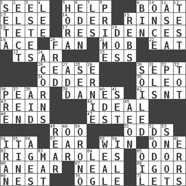 ACROSS 1. Stitch closed the eyes of (a falcon) 5. Aid 9. Water vessel 13. Otherwise 14. Baltic tributary 15. Remove soap 16. Wig 17. Dwellings 19. Adept person 20. Air blower 21. Crowd into 22. Ingest 23. Russian ruler of old 25. Double-curved letter 26. Desist 30. Back-to-school mo. 34. More peculiar 35. Butter sub 36. Lightbulb-shaped fruit 39. Natives or inhabitants of Denmark 42. Is not 43. It's straight from the horse's mouth 44. Perfect 46. Extremities 47. First name in cosmetics 48. Friend of Pooh 51. Probability 54. Call ___ day 57. Ewer handle 58. Acquire through effort 60. Single 62. Frustrating wastes of time 65. Aroma 66. Approach 67. Actress Patricia 68. Russian composer Stravinsky 69. Egg locale 70. Stare 71. Allows DOWN 1. Bristle 2. Choose 3. _____ Park, CO 4. Area sheltered from the wind 5. Israeli folk dance 6. Genesis locale 7. French article 8. A-one 9. Storage container 10. Single time 11. Toward the sea 12. Trial 15. Confederate soldiers (slang) 18. Two (Sp.) 20. Flintstone 24. Oak nuts 27. Say or write further 28. Ocean 29. Bert's buddy 30. Dirtied 31. Raised railways 32. Animal enclosure 33. Small child 36. Before (prefix) 37. Car or cant ending 38. Help 40. Begley and Asner 41. Put into a specified state 45. A really long time 48. Stern 49. Boat paddle 50. U. of Maine site 52. Evade 53. Snout, nose 54. SW Asia republic 55. Prong on a fork 56. Eras 58. Welt 59. Small island 61. Blunders 63. Floor protector 64. Part of a journey 65. Petroleum