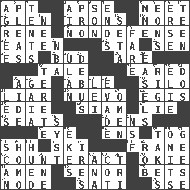 ACROSS 1. Fitting 4. Domed church section 8. Confront 12. Small, secluded valley 14. Metal shackles 16. Greater amount 17. French philosopher Descartes 18. Unrelated to defense, as in spending 20. Ingested 22. R.R. building 23. Elected rep. 24. Double-curved letter 25. Partially opened flower 28. "We ___ not amused" (Victoria) 30. Falsehood 31. Having ears or earlike features 35. Ripen 37. Competent 40. Grain storage tower 41. One who doesn't tell the truth 42. New (sp.) 44. Armor plate that protects the chest 45. Singer Brickell 46. Thailand, formerly 47. Untruth 48. Theater features 50. Habitations of wild animals 52. Sight organ 54. Followers of ems 55. Coat; cloak 58. Quiet! 61. What Jean-Claude Killy likes to do 63. Movie unit 65. Frustrate 70. Migrant worker of the '30s 71. So be it 72. Sir (Sp.) 73. Stakes 74. Connecting point 75. Suttee (variant) 76. Compass dir. DOWN 1. Match 2. Entreaties 3. Portable shelters 4. The 18th letter of the Arabic alphabet 5. Adept person 6. Manchild 7. Conclusions 8. Madame (abbr.) 9. Immeasurably long periods of time 10. Celtic language 11. Adolescent 13. Born 15. Bristle 19. Conductor's collection 21. Basketball assoc. 26. ____ Bator, Mongolia 27. Alight from a bus 29. Artist's stands 30. Cylindrical with tapered ends 32. Swiss mountan, "Queen of the Mountains" 33. Writer Wiesel 34. Two (Sp.) 35. Helper 36. Greek goddess of the earth (variant) 38. Luau accessory 39. Dodge 41. French article 43. Sign of something about to happen 49. System (abbr.) 51. Overdraft (abbr.) 53. Supplements with great effort 55. Proceeds 56. Leaves out 57. Honkers 58. Examine hastily 59. Same (prefix) 60. Became colored 62. Angers 64. Director Reiner 66. Compass dir. 67. Santa ___, CA 68. Small bed 69. Three (prefix)
