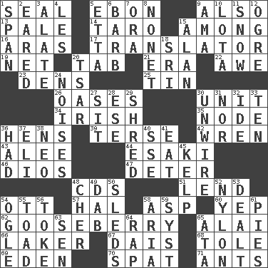 ACROSS 1. Lick closed 5. Inky black, to poets 9. In addition 13. Diluted with white 14. Edible starchy tuberous root 15. Amid 16. Caspian sea tributary 17. Interpreter 19. Fish or hair follower 20. Keyboard key 21. Epoch 22. Deep reverence 23. Hiding places for outlaws 25. Shallow baking pan 26. Fertile tracts in a desert 30. A single undivided whole 34. From or relating to Ireland 35. Thickened enlargement 36. Coop moms 39. Laconic 42. Songbird 43. Toward shelter 44. 1973 Nobel Price Winner (Physics) Leo 46. "Vaya con ____" 47. Prevent from occurring 48. Music discs 51. Grant temporary use of 54. Baseball player Mel 57. Actor Linden 58. Viper 60. Slangy assent 62. Sour, prickly fruit 65. Mountain range southwest of Kyrgyzstan 66. Member of a famous L.A. basketball team 67. Raised platform 68. Lacquered or enameled metalware 69. Locale of original sin 70. Argument over a trivial matter 71. Pismires DOWN 1. Connect, as a bridge 2. Having ears or earlike features 3. Having winglike extensions 4. French article 5. Singer James 6. Sharp remark 7. Mouth or opening 8. Music written for nine 9. Nursemaid (var.) 10. Globular water bottle used in Asia 11. Overwhelm 12. Legendary monster 15. Actor Alda or Thicke 18. Indian title of respect (Mr.) 20. Russian ruler of old 24. Annoying sounds 27. Be seated 28. Compass dir. 29. Tear up 30. Undo the wiring of 31. And not 32. Binary compound 33. Nine, plus one 36. Possessed 37. Connecticut Ivy Leaguer 38. Modern: prefix 40. Compass dir. 41. Consume 45. Seaweed 48. "Mermaids" star 49. Small moist lump or mass 50. Bobsleighs 52. High-strength synthetic material 53. Started a card game 54. Stare at amorously 55. Frog relative 56. Puff or smoke 58. Roberta Peters solo 59. System (abbr.) 61. Sliced desserts 63. Elected rep. 64. Hit sharply and swiftly 65. "One Day ___ Time"
