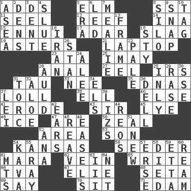 ACROSS 1. Sums up 5. Shade tree 8. Fast jet (abbr.) 11. Stitch closed the eyes of (a falcon) 12. Coral ridge 14. _ tizzy (2 wds.) 15. World-weariness 17. The sixth month of the Jewish calendar 18. Volcanic refuse 19. Michaelmas daisies 21. Portable computer 23. "One Day ___ Time" 25. "If ____ say so..." 26. Of or related to the anus 27. Snakelike fish 28. Big collection agency 31. The 19th letter of the Greek alphabet 33. Born 35. Ferber et al. 37. Hang loosely or laxly 38. Pipe bend 40. Otherwise 41. Wear away 43. Title for a knight 45. Sodium hydroxide 46. Frozen water 47. "We ___ not amused" (Victoria) 50. Ardor 52. Type of rug 53. Manchild 54. Sunflower state 56. Sowing specialist 61. Hindu Mythology: god of death 62. Distinctive style or manner 65. Compose 66. Federal power corp. 67. Writer Wiesel 68. Bristle 69. Declare 70. Be seated 71. Dutch treat DOWN 1. At sea 2. Hiding places for outlaws 3. Gouge 4. Change direction abruptly 5. Epoch 6. Directed 7. Ear of corn 8. Grain storage tower 9. Fastener 10. Label 13. Movie unit 16. SW Asia republic 18. Filthy place 20. Comedian Laurel of Laurel & Hardy 22. Light colored 24. Toward shelter 26. Old (Scot.) 28. In an inward manner 29. To erase 30. Compass dir. 31. Torque (variant) 32. _ vera 34. Raised railways 36. Small valley 37. Flowery wreath 39. Belonging to Elizabeth 42. Hearing organs 44. Vintage cars 48. Break or tear apart 49. Artist's stands 51. Afresh 52. Santa ___, CA 54. Polynesian shrub of the pepper family 55. Like ___ of sunshine 57. Celtic language 58. Passed on 59. Singer James 60. 480, 500 or 516 sheets of paper 61. Mountains (abbr.) 63. One more than two 64. Fish or hair follower