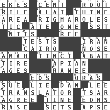 ACROSS 1. Supplements with great effort 5. Penny 9. Carrot, for example 13. Cause heat under the collar 14. Jai ____ 15. One or ones belonging to thee 16. Type of rug 17. Frustrating wastes of time 19. Nervous spasm 20. Had dinner 21. Single 22. Fast jet (abbr.) 23. Nuclear Threat Initiatives 25. To riddle 26. Trials 30. SW Asia republic 34. Capital of Egypt 35. Sense of smell 36. Nanny 39. Tinged 42. Blind as ____ 43. Become fatigued 44. Bee-related 46. Matures 47. The wife of a rajah (variant) 48. Greek goddess of the dawn 51. Mouths or openings 54. Take to court 57. Untruth 58. One of the 12 tribes of Israel 60. Area sheltered from the wind 62. Interpreter 65. Russian ruler of old 66. Match 67. Prong on a fork 68. Immeasurably long periods of time 69. To erase 70. Puts into a specified state 71. Domed church section DOWN 1. Part of Q.E.F. 2. Japanese brewing company 3. Voters do this 4. Ocean 5. Haul 6. Writer Wiesel 7. Tired old horse 8. Southeast Indonesia island 9. 17th letter of the Greek alphabet 10. Petroleums 11. Washington bills 12. Trial 15. Relationship diagram 18. A saturated hydrocarbon 20. Toward the sea 24. Irritating cutaneous sensations 27. Be seated 28. Three (prefix) 29. Echolocation 30. More empty; more void 31. Director Reiner 32. White ___ sheet 33. Fish or hair follower 36. "One Day ___ Time" 37. Russian fighter aircraft 38. "We ___ not amused" (Victoria) 40. Numbers guy (abbr.) 41. Shallow baking pan 45. A really long time 48. Otherwise 49. Lubricate 50. Theater features 52. Columnist Joseph or Stewart 53. Actors Connery and Penn 54. Play the lead 55. Capital and largest city of Mongolia 56. Hearing organs 58. Do not 59. Ancient Greek god of war 61. Celtic language 63. Born 64. Neckwear 65. Afternoon social gathering