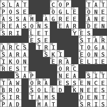ACROSS 1. Narrow board 5. Police officer (slang) 8. Make lace 11. Introduce or present, as a question 12. Stare at amorously 14. Single 15. Indian state 17. Match 18. One (Scot) 19. Thinks logically 21. Hearing organ 22. Lair 23. Indian title of respect (Mr.) 24. Allow 25. It is so 27. Compass dir. 28. Play the lead 31. Curves 35. Three (prefix) 37. Ancient Roman robe 38. "Two Mules for Sister ____" 39. What Jean-Claude Killy likes to do 41. Immeasurably long periods of time 42. Image 43. Period 45. Writer Wiesel 46. State of inaction 47. The grampus (Milton) 49. Plant excrement 51. Teachers' org. 52. Be seated 55. The 23rd letter of the Hebrew alphabet 57. Mouth or opening 60. Substance 62. Sis' sibling 63. Having a sole or soles 65. Leg joints 66. Title for a knight 67. Scottish caps 68. Incision 69. Writing tablet 70. Floor protector 71. Indian titles of respect DOWN 1. Practice fights 2. Failure 3. Slender Brazilian palm 4. Afternoon social gatherings 5. Gear tooth 6. Legendary monster 7. Entreaty 8. Inedible or poisonous agaric 9. Singer Murray 10. Adolescent 13. Suggestive of the supernatural 16. Undercover agent 17. Michaelmas daisies 20. Egg locale 26. First name in cosmetics 29. Hindu god of fire 30. Raze (variant) 31. SW Saudi Arabia district 32. Immoral or dissolute person 33. What you're doing now 34. Before Barbara or Clara 36. D.D.E's nickname 40. Pressed 44. Ancient Greek god of war 48. Keg 50. Mail 52. Scornful expression 53. Ancient Celtic tribe of eastern Britain 54. Trials 55. Cook's measure (abbr.) 56. Operatic vocal solo 58. Wander 59. _ mater 61. Conclusions 64. Eastern Standard Time (abbr.)