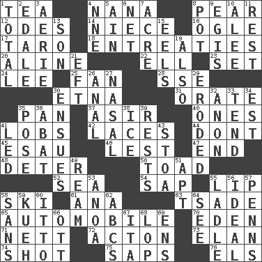 ACROSS 1. Beverage made from leaves 4. Grandmother 8. Lightbulb-shaped fruit 12. Lyric poems 14. Sibling's daughter 16. Stare at amorously 17. Pacific island yam 18. Pleas 20. Place in a line 22. Pipe bend 23. Arrange properly for use 24. Area sheltered from the wind 25. Avid follower 28. Compass dir. 30. Inactive volcano in Sicily 31. Speak pompously 35. Baking dish 37. SW Saudi Arabia district 40. Washington bills 41. Tennis shots 42. Shoestrings 44. Do not 45. He sold his birthright 46. For fear that 47. Conclusion 48. Prevent from occurring 50. Frog relative 52. Ocean 54. Plant excrement 55. Mouth edge 58. What Jean-Claude Killy likes to do 61. Santa ___, CA 63. Sadhe (variant) 65. Form of transportation 70. Genesis locale 71. Remaining after all deductions 72. NE Massachussets city 73. Flair 74. Went for two points 75. Plant excrements 76. Raised railways DOWN 1. "_____ Recall" 2. Peak District village in England 3. Nest on high 4. Compass dir. 5. The 18th letter of the Arabic alphabet 6. Fish or hair follower 7. 43,560 square feet 8. Cooking vessel 9. The front part of a cuirass 10. Toward shelter 11. Relief 13. Male offspring 15. Snakelike fish 19. In addition 21. Bank Draft (abbr.) 26. Of or related to the anus 27. Rhinal 29. Eaten away 30. Follows as a consequence or result 32. Soon (poet.) 33. Be inclined (to) 34. Eastern Standard Time (abbr.) 35. Introduce or present, as a question 36. Blind as ____ 38. Frozen water 39. Musical pauses 41. Directed 43. Portico 49. 480, 500 or 516 sheets of paper 51. Fitting 53. Small Philippine buffalo 55. Dipping utensil 56. Perfect 57. Actor Sean's family 58. Without 59. Malaysian steamed pastry 60. "Tell ____ the Marines!" 62. Lettered men learn these first 64. Perceive with the eye 66. Baseball player Mel 67. Call ___ day 68. Chop off 69. Followers of ems
