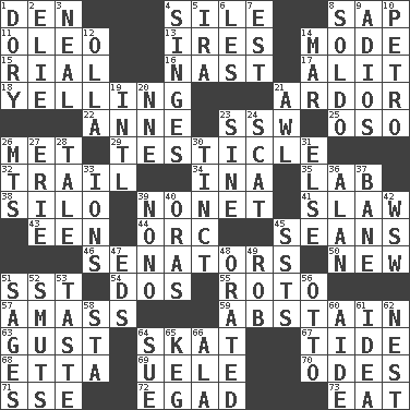 ACROSS 1. Lair 4. Filth; sediment 8. Plant excrement 11. Margarine 13. Angers 14. Method 15. Monetary unit of Yemen 16. Political cartoonist Thomas 17. Came down and settled, as after flight 18. Crying or shouting loudly 21. Zeal 22. Singer Murray 23. Compass dir. 25. Bear (Spanish) 26. Was introduced to 29. One of the two male reproductive glands 32. Get behind 34. _ tizzy (2 wds.) 35. Experiment locale 38. Grain storage tower 39. Music written for nine 41. Cole _ (cabbage dish) 43. Car or cant ending 44. The grampus (Milton) 45. Seines 46. Elected representatives 50. ___ Haven, CT 51. Fast jet (abbr.) 54. Two (Sp.) 55. Printing process, for short 57. Collect or gather 59. Choose not to consume 63. Abrupt rush of wind 64. Three-handed card game 67. Periodic rise and fall of the sea level 68. Singer James 69. Ubangi River tributary 70. Lyric poems 71. Compass dir. 72. Mild oath 73. Erode DOWN 1. Rowboat 2. Writer Wiesel 3. Actress Patricia 4. Burns superficially 5. Lyricist Gershwin 6. French article 7. Eastern Standard Time (abbr.) 8. Twentieth part of a lira 9. Goodbye (Sp.) 10. Stone: prefix 12. Rounded earthenware pot or jar 14. Make imperfect 19. International (abbr.) 20. Compass dir. 21. Leather borer 23. Trig term 24. Get outta here! 26. Mountains (abbr.) 27. 4th largest of the Great Lakes 28. Story 30. Colored lightly or faintly 31. Otherwise 33. Charged particles 36. ____ Jay Lerner 37. Object of repulsion 39. Words to Nanette 40. Mouths or openings 42. Compass dir. 45. Fast planes 47. Begley and Asner 48. Declaimed 49. Director Reiner 51. Gurus 52. Obscenities 53. Clothes sense 56. "Beetle Bailey" pooch 58. R.R. building 60. Assistant 61. It may be bright or harebrained 62. Egg locale 64. Take to court 65. Cask 66. In the manner of