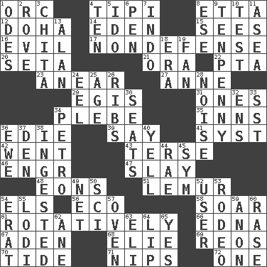 ACROSS 1. The grampus (Milton) 4. Native american tent (variation) 8. Singer James 12. Capital of the state of Qatar 14. Paradise 15. Perceives with the eye 16. Morally bad or wrong 17. Unrelated to defense, as in spending 20. Stalk of a moss capsule 21. Mouth or opening 22. Parent Teacher Association (abbr.) 23. Approach 27. Singer Murray 29. Armor plate that protects the chest 31. Singles 34. First-year military academy student 35. Restaurants 36. Singer Brickell 39. Declare 41. System (abbr.) 42. Gone 43. Laconic 46. Engineer (abbr.) 47. Kill 48. Immeasurably long periods of time 51. Arboreal primate 54. Raised railways 56. Environmental prefix 58. Fly high 61. Happening in regular succession 66. Pulitzer Prize-winning author Ferber 67. Arabian gulf 68. Writer Wiesel 69. Vintage cars 70. Periodic rise and fall of the sea level 71. Cuts off 72. Single DOWN 1. Lyric poems 2. Be footloose 3. Riviera of "Kiss of the Spider Woman" 4. Nine, plus one 5. Wedding promise 6. Writing instrument 7. _ china 8. Compass dir. 9. 3-inch nail 10. Trial 11. Toward the sea 13. Actor Alda or Thicke 18. Epoch 19. Avid follower 24. Snakelike fish 25. Mature 26. Teases 28. Annoying sound 30. Theater features 32. Followers of ems 33. Fast jet (abbr.) 34. Stone: prefix 36. She-sheep 37. Lair 38. Consumed 40. Shout 44. Actress Charlotte 45. Symbol (abbr.) 49. Fish or hair follower 50. _-fi 52. One who uses or employs something 53. Cowboy competition 54. Part of Q.E.F. 55. Farming town in central California 57. Baking chamber 59. At once, immediately (arch.) 60. To erase 62. A saturated hydrocarbon 63. Biblical high priest 64. Mouth edge 65. Consenting reply