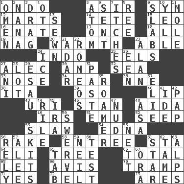 ACROSS 1. Southwest Nigerian state 5. SW Saudi Arabia district 9. Symbol (abbr.) 12. Shops 14. False hair 15. Lion 16. Related on the mother's side 17. Single time 18. 100% 19. Tired old horse 20. Heat 23. Competent 24. Southeast Asian peninsula 25. Snakelike fish 27. Actor Baldwin 30. Electrical Unit 32. Ocean 33. Characteristic smell of wine 34. Buttocks 36. Compass dir. 38. Call ___ day 39. Bear (Spanish) 40. Mouth edge 43. RI univ. 46. Comedian Laurel of Laurel & Hardy 48. Opera by Verdi 49. Big collection agency 51. Australian flightless bird 52. Ooze 53. Cole _ (cabbage dish) 54. Pulitzer Prize-winning author Ferber 56. Immoral or dissolute person 58. Main course 61. R.R. building 64. Connecticut Ivy Leaguer 65. Woody plant 66. Add up to 68. Allow 69. Deliberation 70. _____ steamer (cargo ship) 71. Affirmative reply 72. Waist strap 73. Ancient Greek god of war DOWN 1. Presage 2. Grandmother 3. To trail on the ground 4. Baseball player Mel 5. Tiny particle 6. Transmitted 7. Irritating cutaneous sensations 8. To sift 9. Broad, flat, thick pieces 10. Shout 11. Undercover agent 13. Stitched 21. The sixth month of the Jewish calendar 22. Lover boys 23. Actor Alda or Thicke 24. Frozen water 26. Car or cant ending 27. Black tropical American cuckoo 28. Car dealer's back yard 29. Son of Isaac 31. Thick mixture 35. Wanderer 37. Writer Wiesel 41. Binary compound 42. Infant food 44. Cause heat under the collar 45. Lyricist Gershwin 47. Naked 48. White ___ sheet 50. Turn aside suddenly 53. Burlesque acts 55. Remaining after all deductions 56. Have trust in 57. Toward shelter 59. Famous astronaut Armstrong 60. Trial 61. Play the lead 62. Docile 63. High mountains 65. Bar bill 67. Mouth or opening