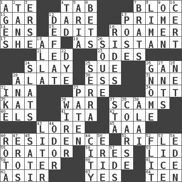 ACROSS 1. Had dinner 4. Keyboard key 7. Alliance 11. Slender fish 12. Have the gumption 13. First class 14. Followers of ems 15. Prepare for publication 16. Wanderer 17. Archer's quiver 19. Helper 21. Directed 23. Lyric poems 24. Kill 25. Take to court 26. Separate the seeds from cotton 29. Having winglike extensions 30. Curvy letter 31. Compass dir. 32. _ tizzy (2 wds.) 33. Before (prefix) 34. Baseball player Mel 35. Krazy ___ of comics 36. Armed conflict 37. Fraudulent business schemes 40. Raised railways 41. Call ___ day 42. Lacquered or enameled metalware 43. Old wives' tales, e.g. 45. American Automobile Association (abbr.) 46. Dwelling 51. Firearm 55. Speaker 56. Angers 58. Flaplike covering 59. Carrier 60. Periodic rise and fall of the sea level 61. Frozen water 62. SW Saudi Arabia district 63. Affirmative reply 64. "___ Little Indians" DOWN 1. Grows older 2. Hyperbolic tangent 3. Celtic language 4. Bit 5. Operatic vocal solo 6. Stakes 7. Naughty children 8. Pale green bean 9. Presage 10. Sure thing 12. Outscore 13. Airs 16. Amusement-park features 18. Silent film actress Nazimova 20. Boozer 22. Color 24. Narrow boards 25. Father Junipero _ 26. Dwarf 27. Pismires 28. Fish or hair follower 29. Of or related to the anus 32. Eisenhower's nickname 33. Eucharist need 36. One who wires 37. R.R. building 38. Unrefined 39. Mountain range southwest of Kyrgyzstan 43. 61 cubic inches 44. Aroma 46. Roll call or roster of names 47. Greek god of love 48. Suttee (variant) 49. Municipality 50. One of the Great Lakes 52. Secret move to avoid paying debts 53. Louse (plural) 54. Genesis locale 57. Begley and Asner
