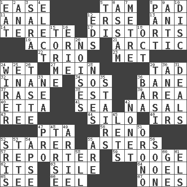ACROSS 1. Comfort 5. Scottish cap 8. Groovy apt. 11. Of or related to the anus 12. Celtic language 13. Cuckoo 14. Cylindrical with tapered ends 17. What propaganda does 19. Oak nuts 21. Northern region 22. Musical group of three 23. Was introduced to 24. Soggy 27. Count _ (2 wds.) 29. Bit 32. Empty; void 34. Distress signal 36. Object of repulsion 37. Raze (variant) 38. Eastern Standard Time (abbr.) 39. Length times width 40. Singer James 41. Ocean 42. Rhinal 43. Portuguese money of account (variant) 44. Grain storage tower 46. Big collection agency 47. Parent Teacher Assoc. 50. Western Nevada city 52. A viewer who gazes fixedly 55. Michaelmas daisies 57. Newsperson 59. Moe Howard, for one 62. It is 63. Drop; flow; fall 64. Christmas carol 65. Observe 66. Snakelike fish 67. Singles DOWN 1. Consume 2. A saturated hydrocarbon 3. "Two Mules for Sister ____" 4. Voters do this 5. Three (prefix) 6. Indian state 7. Distance measurement (Brit.) 8. Component 9. Against 10. Plate 12. Begley and Asner 15. Singer Mel 16. 4th largest of the Great Lakes 18. Sep. follower 20. Annoying sounds 24. One who wires 25. Related on the mother's side 26. Clothes sense 28. Olfactory organs 29. Tarsus (plural) 30. Approach 31. Allots cards 33. Teachers' org. 35. Flight of steps 36. Sound made by sheep 42. Music written for nine 45. Allows 47. Adept person 48. Laconic 49. Nick name for Arthur 51. U. of Maine site 52. Indian titles of respect 53. False hair 54. Domed church section 55. "We ___ not amused" (Victoria) 56. Within a short period 58. Pipe bend 60. Turn to the right 61. Raised railways