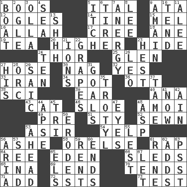 ACROSS 1. Expressions of contempt or scorn 5. Slanted text style (abbr.) 9. "One Day ___ Time" 12. Stares 14. Prong on a fork 15. Cartoonist voice _ Blanc 16. Assad's deity 17. Algonquian 18. A saturated hydrocarbon 19. Beverage made from leaves 20. Having greater elevation 23. Flintstone garb 24. Son of Odin 25. Small, secluded valley 27. Flexible conduit 30. Tired old horse 32. Consenting reply 33. SW Asia republic 34. Specific locale 36. Baseball player Mel 38. _-fi 39. Ewer handle 40. Santa ___, CA 43. Feline 46. _ gin 48. Mine, in Marseilles 49. Before (prefix) 51. Filthy place 52. Stitched 53. SW Saudi Arabia district 54. Sharp bark 56. American tennis player Robert 58. Threatening words 61. Strike 64. To sift 65. Genesis locale 66. Bobsleighs 68. _ tizzy (2 wds.) 69. Grant temporary use of 70. Is inclined (to) 71. Say or write further 72. Fast planes 73. Trial DOWN 1. Water vessel 2. Stare at amorously 3. Spanish pot 4. Ocean 5. Hankering 6. Become fatigued 7. Disorder of the immune system 8. Area sheltered from the wind 9. With great haste 10. Watch over 11. Toward shelter 13. Quiet! 21. Charged atoms 22. Wine fruits 23. Behest 24. "___ Little Indians" 26. Lion 27. Part of HMS, perhaps 28. The grampus (Milton) 29. Ketch in the Levant 31. Purposes of endeavors 35. Trinitrotoluene 37. Docile 41. At this time 42. The 18th letter of the Arabic alphabet 44. Domed church section 45. Three (prefix) 47. Snake ____ (dice throw) 48. Viper 50. Eats (away) 53. At or in the front 55. For fear that 56. Operatic vocal solo 57. Transmit 59. Monthly bill 60. Extremities 61. French philosopher Descartes 62. Sums up 63. Inconspicuous attention getter 65. Raised railways 67. Allow
