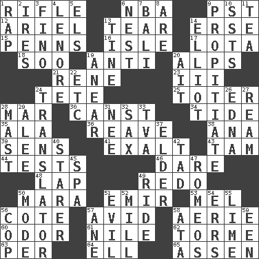 ACROSS 1. Ransack; plunder; pillage 6. Basketball assoc. 9. Pacific Standard Time (abbr.) 12. Satellite of Uranus 13. Pull into pieces 14. Celtic language 15. Actor Sean's family 16. Capri or Wight 17. Globular water bottle used in Asia 18. "Barney Miller" actor Jack 19. Against 20. High mountains 21. French philosopher Descartes 23. One more than two 24. False hair 25. Carrier 28. Spoil 30. 2nd pers. sing. pres. of can (arch.) 34. Event that recurs at intervals 35. According to 36. Rob, plunder, or pillage 38. Santa ___, CA 39. Elected reps. 41. Honor 43. Scottish cap 44. Trials 46. Have the gumption 48. Infant locale 49. Do over again 50. Hindu Mythology: god of death 51. Independent ruler or chieftain 53. Cartoonist voice _ Blanc 56. ____ d'Azur (French Riviera) 57. Enthusiastic 58. Nest on high 60. Aroma 61. Mediterranean tributary 62. Singer Mel 63. For each 64. Pipe bend 65. NE Netherlands city DOWN 1. Strike 2. Angers 3. Fine (Spanish) 4. Poe poem 5. Raised railways 6. A home for chicks 7. Indonesian resort city 8. "We ___ not amused" (Victoria) 9. Conciliate 10. Fast planes 11. Beverage made from leaves 13. Prong on a fork 14. American author Paul (1891-1958) 19. Approach 20. Small island 22. And so on (abbr.) 24. Interpreter 26. Pulitzer Prize-winning author Ferber 27. 480, 500 or 516 sheets of paper 28. Vertical spar for supporting sails 29. Toward shelter 31. Born 32. Saxophone 33. Federal power corp. 37. A person who is older than you are 40. A viewer who gazes fixedly 42. Small amount or degree 45. Health resort 47. Lover boys 49. Travel on or in a vehicle 50. Method 51. Morally bad or wrong 52. Place where flour is made 54. Blunders 55. Welles in "The Third Man" 56. Police officer (slang) 57. One (Scot) 58. "One Day ___ Time" 59. Car or cant ending