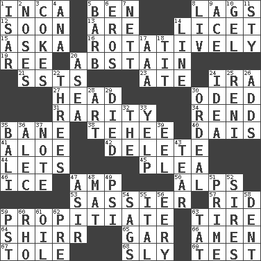 ACROSS 1. South American Indian 5. Benjamin's nick name 8. Fails to keep up a pace 12. Within a short period 13. "We ___ not amused" (Victoria) 14. It is permitted: Lat. 15. "____ silly question..." 16. Happening in regular succession 19. Portuguese money of account (variant) 20. Choose not to consume 21. Fast planes 23. Had dinner 24. Retirement account (abbr.) 27. Froth on beer 30. Wrote a lyric poem 31. Noteworthy scarcity 34. Tear apart 35. Object of repulsion 38. Giggle 40. Raised platform 41. Medicinal plant 42. Erase 44. Allows 45. Entreaty 46. Frozen water 47. Electrical Unit 50. High mountains 53. More impudent 57. To free from 59. Appease 63. Hoop that covers a wheel 64. Bake eggs in their shells 65. Slender fish 66. So be it 67. Lacquered or enameled metalware 68. Secret 69. Trial DOWN 1. Austrian river, tributary to the Danube 2. Olfactory organs 3. Popular sodas 4. Santa ___, CA 5. Sharp remark 6. Greek god of love 7. Remaining after all deductions 8. 54 in ancient Rome 9. Adept person 10. Set 11. Filthy place 14. Actor's bit 17. American Automobile Association (abbr.) 18. Teat (slang) 20. At sea 22. Triads 24. It may be bright or harebrained 25. Painter Guido (1575-1642) 26. Does sums 28. Tate display 29. Passed on 30. Severe or trying experience 32. Definite Article 33. Sharp bark 35. Indonesian resort city 36. Actor Baldwin 37. Observe 39. Snakelike fish 43. Pull apart 47. SW Saudi Arabia district 48. Floor covering 49. Air pressure measure (abbr.) 51. First class 52. Male parents of animals 54. Droops 55. Slanted text style (abbr.) 56. Suggestive of the supernatural 58. Scratch 59. Pacific Standard Time (abbr.) 60. 17th letter of the Greek alphabet 61. Petroleum 62. Before (prefix) 63. Make lace