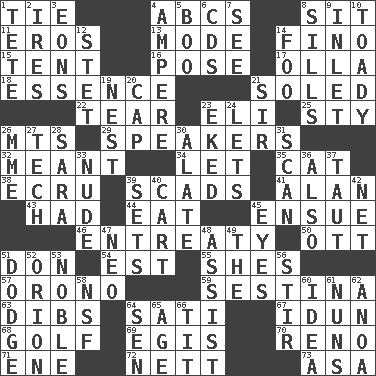 ACROSS 1. Standoff 4. Lettered men learn these first 8. Be seated 11. Greek god of love 13. Method 14. A pale, very dry sherry 15. Portable shelter 16. Introduce or present, as a question 17. Spanish pot 18. Core 21. Having a sole or soles 22. Separate forcefully 23. Connecticut Ivy Leaguer 25. Filthy place 26. Mountains (abbr.) 29. Orators 32. Intended 34. Allow 35. Domesticated feline 38. Shade of tan 39. Loads 41. Actor Alda or Thicke 43. Possessed 44. Ingest 45. Follow as a consequence or result 46. Plea 50. Baseball player Mel 51. Spanish title 54. Eastern Standard Time (abbr.) 55. "______ My Girl" (Turtles hit) 57. U. of Maine site 59. French poetic form 63. Claim 64. Suttee (variant) 67. Goddess of spring and wife of Bragi 68. _ course 69. Armor plate that protects the chest 70. Former U.S. Attorney General Janet 71. Compass dir. 72. Remaining after all deductions 73. White ___ sheet DOWN 1. False hair 2. Angers 3. Immeasurably long periods of time 4. Electrical Unit 5. Sometimes accompanies a hiss 6. Music discs 7. Observe 8. Beverly of Met fame 9. An arm off of a larger body of water 10. Sycophant 12. Proofreading order 14. Egg _ yung 19. A home for chicks 20. Head covering 21. Title for a knight 23. Supplemented with great effort 24. Allows 26. Madame (abbr.) 27. Technician 28. "Two Mules for Sister ____" 30. Having winglike extensions 31. Skim 33. Naked 36. In addition 37. Tense 39. Puts into a specified state 40. Haul 42. Fish or hair follower 45. Snake ____ (dice throw) 47. Modern: prefix 48. Aid 49. Definite Article 51. Evade 52. Greek mythologigal hunter 53. Having high moral qualities 56. Use a swizzle stick 58. Overdraft (abbr.) 60. The main thing one is thinking about 61. Religious women 62. Small Philippine buffalo 64. Elected rep. 65. Mature 66. Teat (slang)