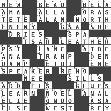ACROSS 1. ___ Haven, CT 4. Necklace unit 8. Actor Lugosi 12. Nursemaid (var.) 13. Silent film actress Nazimova 14. Mouths or openings 15. False hair 17. Actor Alda or Thicke 18. 0 degrees 19. Foe 21. Girls' org. (abbr.) 23. A female animal or person 24. Frees from moisture 26. Health resort 28. Russian ruler of old 30. Cordwainer's material 34. Pacific Standard Time (abbr.) 37. Unable to walk 39. Helper 40. Santa ___, CA 41. _____ steamer (cargo ship) 43. Lair 44. Moist 46. Needle holder 47. Compass dir. 48. Orator 51. San ____ (Riviera town) 54. Born 55. Beverly of Met fame 58. Find the sum of 61. Raised railways 63. Adhesives 65. Memorize 67. Christmas carol 71. Of or related to the anus 72. Writer Wiesel 73. Southwest Nigerian state 74. White ___ sheet 75. Otherwise 76. 270 degrees 77. Marina Del _, California DOWN 1. Nathan's nickname 2. Make improvements or corrections to 3. Wetness 4. Sound made by sheep 5. Pipe bend 6. Chicken ___ king 7. Mild oath, euphamism for damn 8. Oct. 31 cry 9. Blunders 10. Thin strip of wood or metal 11. American tennis player Robert 16. Send forth 18. California wine valley 20. Affirmative reply 22. Compass dir. 25. Table seasoning 27. _ moment's notice (2 wds.) 29. More valued for its uncommonness 30. Arboreal primate 31. Flintstone garb 32. Genesis locale 33. French philosopher Descartes 34. Groovy apts. 35. Fastener 36. Docile 38. Floor protector 42. Sliced desserts 45. Baking dish 49. Peachy ____! 50. Snakelike fish 52. Russian fighter aircraft 53. Rounded earthenware pot or jar 56. Type of eclipse 57. Gospel singer Marvin 58. Toward shelter 59. Small valley 60. Raised platform 62. Frozen precipitation 64. Kill 66. To riddle 68. Single 69. Begley and Asner 70. Car dealer's back yard