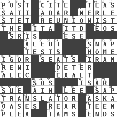 ACROSS 1. Mail 5. Quote 9. Afternoon social gatherings 13. Suttee (variant) 14. The sixth month of the Jewish calendar 15. Haggard of country music 16. Proofreading order 17. One who advocates reunion 19. Definite Article 20. Call ___ day 21. It would 22. Greek goddess of the dawn 23. Indian titles of respect 25. Compass dir. 26. Native American of Southwest Alaska 30. Fastener 34. Trials 35. Residence 36. Russian composer Stravinsky 39. Theater features 42. SW Asia republic 43. Painter Guido (1575-1642) 44. Prevent from occurring 46. Actor Baldwin 47. Glorify 48. Mayday 51. Austrian river, tributary to the Danube 54. Take to court 57. Direct toward a target or goal 58. Area sheltered from the wind 60. Plant excrement 62. Interpreter 65. "____ silly question..." 66. Fertile tracts in a desert 67. Buttocks 68. Adolescent 69. Entreaty 70. Scottish caps 71. Extremities DOWN 1. Inconspicuous attention getter 2. Curses 3. Navigate 4. Teat (slang) 5. Draw slowly or heavily 6. The content of cognition 7. The 19th letter of the Greek alphabet 8. Bert's buddy 9. Nine, plus one 10. 4th largest of the Great Lakes 11. In addition 12. Arranges properly for use 15. Method 18. ___ a Wonderful Life 20. Capri or Wight 24. Of or pertaining to medicine 27. Double-curved letter 28. Shoshoni 29. Sadhe (variant) 30. Upper-body garments 31. Or not 32. Nanny (var.) 33. Writing instrument 36. Retirement account (abbr.) 37. Set 38. Single 40. John Ritter's dad 41. R.R. building 45. Writer Wiesel 48. Backtalk 49. Lubricate 50. Don Adams' spy role 52. NE Netherlands city 53. Swept the length of 54. Discontinue 55. Mountain range 56. Relaxation 58. Rich soil 59. Blunders 61. Zero-star reviews 63. Teachers' org. 64. Beverage made from leaves 65. Had dinner