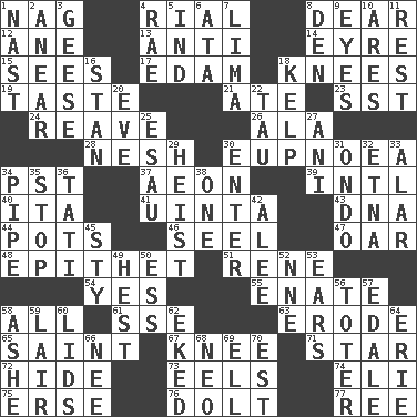 ACROSS 1. Tired old horse 4. Monetary unit of Yemen 8. Letter starter 12. A saturated hydrocarbon 13. Against 14. Jane of fiction 15. Observes 17. Dutch treat 18. Leg joints 19. Clothes sense 21. Had dinner 23. Fast jet (abbr.) 24. Rob, plunder, or pillage 26. Chicken ___ king 28. Soft 30. Normal relaxed breathing 34. Pacific Standard Time (abbr.) 37. Age 39. International (abbr.) 40. Call ___ day 41. National forest in Provo, Utah 43. Heredity factor (abbr.) 44. Plant holders 46. Sew up the eyelids of hawks and falcons 47. Boat paddle 48. Curse 51. French philosopher Descartes 54. Affirmative reply 55. Related on the mother's side 58. 100% 61. Compass dir. 63. Wear away 65. Inhabitant of Heaven 67. Leg joint 71. Play the lead 72. Flintstone garb 73. Snakelike fish 74. Connecticut Ivy Leaguer 75. Celtic language 76. Dunce 77. To sift DOWN 1. Political cartoonist Thomas 2. Approach 3. Honkers 4. Actress Charlotte 5. Indiana (abbr.) 6. "One Day ___ Time" 7. Pale green bean 8. Lair 9. Snake ____ (dice throw) 10. Ancient Greek god of war 11. Repose 16. Comedian Laurel of Laurel & Hardy 18. Seaweed 20. Night before a holiday 22. The 19th letter of the Greek alphabet 25. He sold his birthright 27. Black tropical American cuckoo 29. Robbery 30. Keyboard key 31. Southwest Nigerian state 32. Inactive volcano in Sicily 33. Having or resembling wings 34. Corncob 35. Obstruct or block passage 36. Jacques of French films 38. Single 42. Toward shelter 45. Filthy place 49. Behest 50. Double-curved letter 52. Compass dir. 53. Hearing organs 56. Carrier 57. Peak District village in England 58. American tennis player Robert 59. Den 60. Hats (slang) 62. Supplemented with great effort 64. 4th largest of the Great Lakes 66. Born 68. Modern: prefix 69. Pipe bend 70. Eastern Standard Time (abbr.)