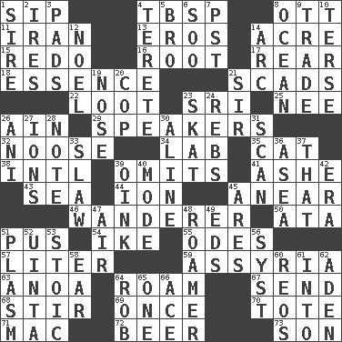 ACROSS 1. Small drink 4. Cook's measure (abbr.) 8. Baseball player Mel 11. SW Asia republic 13. Greek god of love 14. Measure of real estate 15. Make new 16. Carrot, for example 17. Posterior 18. Gist 21. Oodles 22. Spoils 23. _ Lanka 25. Born 26. The 18th letter of the Arabic alphabet 29. Orators 32. Trap for birds or small mammals 34. Experiment locale 35. Domesticated feline 38. International (abbr.) 39. Leaves out 41. American tennis player Robert 43. Ocean 44. Electrically charged atom 45. Approach 46. Roamer 50. "One Day ___ Time" 51. Fluid product of inflammation 54. Mamie's mate 55. Lyric poems 57. 61 cubic inches 59. Nineveh was its capital 63. Small Philippine buffalo 64. Wander aimlessly 67. Transmit 68. Disorderly outburst 69. At one time in the past 70. Carry 71. Big _ 72. Fermented drink made from hops 73. Male child DOWN 1. Title for a man of rank and authority 2. Angers 3. Groovy apts. 4. Cylindrical with tapered ends 5. Sis' sibling 6. "Barney Miller" actor Jack 7. Pacific Standard Time (abbr.) 8. Sea 9. Exchange 10. Laconic 12. Christmas carol 14. Curve 19. Characteristic smell of wine 20. Police officer (slang) 21. Title for a knight 23. Three-handed card game 24. Confederate soldiers (slang) 26. Cuckoo 27. Charged atoms 28. Observe 30. Place in a line 31. Examine hastily 33. Cole _ (cabbage dish) 36. At sea 37. Not this but _ 39. Pig sound 40. Method 42. Epoch 45. Ancient Greek god of war 47. Wind 48. Nomad 49. Begley and Asner 51. Suffix with ecto or cyto 52. National forest in Provo, Utah 53. Unemotional 56. System (abbr.) 58. Hearing organ 60. Vintage cars 61. To the inside or interior of 62. Arabian gulf 64. Director Reiner 65. Single 66. Adept person