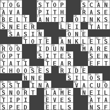 ACROSS 1. Coat; cloak 4. Constrict 8. Examine minutely or intensely 12. Actress Gardner 13. Essential or central part 14. Raze (variant) 15. Waist strap 17. Opposed to 18. Pig sounds 19. Scornful expression 21. Flowery wreath 23. Make lace 24. Indian antelope 26. Single 28. Haul 30. Short socks 34. Friend of Pooh 37. Goddess of spring and wife of Bragi 39. Female horse 40. Elect 41. Locates 43. Elected rep. 44. Jacques of French films 46. Pull into pieces 47. Newt 48. Elects 51. Travel on an animal 54. Compass dir. 55. Grain storage towers 58. Fast jet (abbr.) 61. _ tizzy (2 wds.) 63. In a vacuum (with "in") 65. Derisive sound 67. Unable to walk 71. Famous astronaut Armstrong 72. Native american tent (variation) 73. Nights before holidays 74. "One Day ___ Time" 75. Broke a traffic law 76. Snakelike fish 77. Overdraft (abbr.) DOWN 1. Bar bills 2. Baking chambers 3. An organ shaped like a helmet 4. Health resort 5. Shallow baking pan 6. Baseball player Mel 7. Silvers or Donahue 8. _ Lanka 9. Patter 10. "____ silly question..." 11. A home for chicks 16. Trial 18. Pig sound 20. River (Sp.) 22. Age 25. Nuclear Threat Initiatives 27. Shade tree 29. Proofreads 30. Approach 31. Relaxation 32. Unclean, religiously 33. Posted 34. College mil. group 35. Brightly colored fish 36. "Beetle Bailey" pooch 38. Shoshoni 42. Indian titles of respect 45. Electrically charged atom 49. In a ____ (agitated or irritated) 50. Car or cant ending 52. HTML Container Element 53. Flair 56. Sea 57. Sets or collections 58. Fast planes 59. Sever or remove by pinching or nipping 60. Drink excessively 62. Toward shelter 64. Norwegian king 66. To free from 68. "___ Maria" 69. Cartoonist voice _ Blanc 70. Double-curved letter