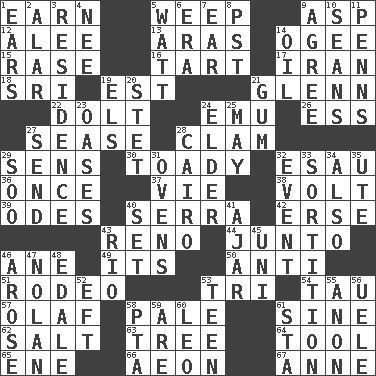 ACROSS 1. Merit 5. Shed a tear 9. Cleo's killer 12. Toward shelter 13. Ancient river in northeast Turkey 14. Double curve, resembling the letter S 15. To erase 16. Small pie 17. SW Asia republic 18. _ Lanka 19. Eastern Standard Time (abbr.) 21. American astronaut and politician John 22. Stupid person 24. Australian flightless bird 26. Double-curved letter 27. Gospel singer Marvin 28. Burrowing marine mollusk 29. Elected reps. 30. Sycophant 32. He sold his birthright 36. At one time in the past 37. Compete 38. Electrical Unit 39. Lyric poems 40. Spanish missionary in California 42. Celtic language 43. Former U.S. Attorney General Janet 44. Secret group 46. One (Scot) 49. It is 50. Opposed to 51. Cowboy competition 53. Three (prefix) 54. The 19th letter of the Greek alphabet 57. Norwegian king 58. Diluted with white 61. Trig term 62. Table seasoning 63. Family _ (genealogy) 64. Utensil 65. Compass dir. 66. A really long time 67. Queen of England 1702-14 DOWN 1. Hearing organs 2. Having or resembling wings 3. Dwelling 4. Born 5. Electrical Unit 6. Epoch 7. Hearing organ 8. Pacific Standard Time (abbr.) 9. Match 10. Seines 11. Actor Sean's family 14. Petroleum 19. Raised railways 20. Proofreading order 21. Chewing product 23. Fertile tracts in a desert 24. A person who is older than you are 25. Fifth month 27. Post 28. Capital of Egypt 29. "Barney Miller" actor Jack 31. Baking chambers 32. Happening 33. Decision 34. In addition 35. Shoshoni 40. Arrange properly for use 41. Partly open 43. River (Sp.) 45. Corn or form start 46. Came up 47. Pitcher Ryan 48. Peak District village in England 52. Bank Draft (abbr.) 53. Adolescent 55. At once, immediately (arch.) 56. Ubangi River tributary 58. Parent Teacher Association (abbr.) 59. "We ___ not amused" (Victoria) 60. Lion 61. R.R. building