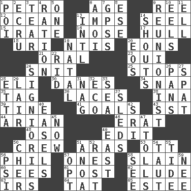 ACROSS 1. Stone: prefix 6. Grow older 9. To sift 12. Sea 13. Naughty children 14. Sew up the eyelids of hawks and falcons 15. Feeling or showing extreme anger 16. Olfactory organ 17. Frame or body of a ship 18. RI univ. 19. Nuclear Threat Initiatives 20. Immeasurably long periods of time 21. Taken by mouth 23. Fr. "Yes" 24. In a ____ (agitated or irritated) 25. Ceases 28. Connecticut Ivy Leaguer 30. Natives or inhabitants of Denmark 34. Fastener 35. Label 36. Shoestrings 38. _ tizzy (2 wds.) 39. Prong on a fork 41. Purposes of endeavors 43. Fast jet (abbr.) 44. Believer in; advocate of (suffix) 46. Part of Q.E.F. 48. Bear (Spanish) 49. Prepare for publication 50. Ship's personnel 51. Caspian sea tributary 53. Baseball player Mel 56. Silvers or Donahue 57. Washington bills 58. Killed 60. Perceives with the eye 61. Mail 62. Evade 63. Big collection agency 64. Make lace 65. First name in cosmetics DOWN 1. Luau course 2. Shade of tan 3. Pull into pieces 4. Food allowance for one day 5. Single 6. Mine, in Marseilles 7. Global Positioning Systems (abbr.) 8. Compass dir. 9. One who advocates reunion 10. Snakelike fish 11. Pipe bend 13. International (abbr.) 14. Yells 19. Relating to or accompanying birth 20. Greek goddess of the dawn 22. To free from 24. Seigniories (variant) 26. Zero-star reviews 27. Argument over a trivial matter 28. Singer James 29. Den 31. Tired old horse 32. Environmental prefix 33. Ocean 37. Bobsleighs 40. Artist's stands 42. _ Lanka 45. Immediately 47. Ringlike coral islands and reefs 49. Compass direction 50. "Mermaids" star 51. Small Philippine buffalo 52. Respite 54. Tense 55. Periodic rise and fall of the sea level 56. Air pressure measure (abbr.) 57. Choose 58. Perceive with the eye 59. Born