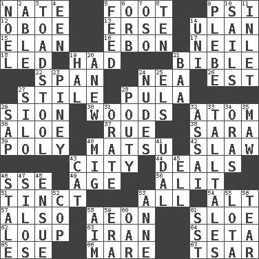 ACROSS 1. Nathan's nickname 5. 12 inches 9. 23rd letter of the Greek alphabet 12. Mitch Miller's instrument 13. Celtic language 14. ____ Bator, Mongolia 15. Flair 16. Inky black, to poets 17. Famous astronaut Armstrong 18. Directed 19. Possessed 21. Instruction Manual for Humans 22. Connect, as a bridge 24. Teachers' org. 26. Eastern Standard Time (abbr.) 27. Vertical member of a panel or frame 28. Monetary unit of Botswana 29. The Jewish people; Israel 30. Forest 32. Smallest unit of an element 36. _ vera 37. Sorrow 38. "Two Mules for Sister ____" 39. More than one (prefix) 40. Taiwanese island in East China Sea 42. Cole _ (cabbage dish) 43. Municipality 44. Allots cards 46. Compass dir. 49. Mature 50. Came down and settled, as after flight 51. Tinged 53. 100% 54. The first octave above the treble staff 57. In addition 58. Age 61. A type of plum 62. Central Nebraska county 63. SW Asia republic 64. Bristle 65. Compass dir. 66. Female horse 67. Russian ruler of old DOWN 1. Christmas carol 2. Competent 3. Inedible or poisonous agaric 4. Car or cant ending 5. Nourish 6. Globe 7. Bear (Spanish) 8. "___ Little Indians" 9. First-year military academy student 10. Moves on water 11. An arm off of a larger body of water 14. University (slang) 19. Actor Linden 20. Afresh 21. Sound made by sheep 23. Abounding in pines 24. Unadorned figures 25. Raised railways 27. Grain storage tower 28. Marked by pouting 29. Plant excrement 31. Speak pompously 32. Slender Brazilian palm 33. Baron Munchausen's specialties 34. Mouths or openings 35. Opening into something insatiable 40. Russian fighter aircraft 41. Hereditary estate 43. Feline 45. Pipe bend 46. Lacking originality or spontaneity 47. Grain storage towers 48. Follow as a consequence or result 52. Police officer (slang) 53. Queen of England 1702-14 55. Globular water bottle used in Asia 56. Lacerate 58. Direct toward a target or goal 59. Epoch 60. Rowing implement 61. Fast jet (abbr.)