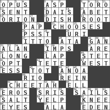 ACROSS 1. Musical composition 5. Cleo's killer 8. "Corrida" creature 12. Posted 13. Raised platform 15. Collude with 16. Greek mythologigal hunter 18. Food container 19. Carrot, for example 20. Infant food 22. Opts 24. Inconspicuous attention getter 26. RI univ. 27. "Tell ____ the Marines!" 28. "One Day ___ Time" 29. Separate the seeds from cotton 32. ____ Jay Lerner 35. Naughty children 37. "We ___ not amused" (Victoria) 38. Yearn 39. Pet locale 40. Proofreading order 41. Elect 42. Wig 43. 270 degrees 44. Double-curved letter 45. Small child 46. Small Philippine buffalo 49. _ de Janeiro 50. It's straight from the horse's mouth 51. Leopard's kin 55. Pipe bend 56. Greek god of love 57. Indian titles of respect 59. Travel by water 63. Table seasoning 64. Sharp bark 65. Leg joint 66. Sight organs 67. According to 68. Locale of original sin DOWN 1. Bear (Spanish) 2. For each 3. Corn or form start 4. Closing up, plugging up 5. Find the sum of 6. Ketch in the Levant 7. Expression of disdain 8. Tarsus (plural) 9. Mitch Miller's instrument 10. Vintage cars 11. Baseball player Mel 14. Yells 17. Political cartoonist Thomas 21. Pacific Standard Time (abbr.) 23. Mouth or opening 25. Bathroom plumbing fixture 28. Seem 29. Yard entry 30. Ancient Greek god of war 31. Remaining after all deductions 32. Medicinal plant 33. Chops off 34. Pismires 36. Floor covering 40. Tchaikovsky ballet 42. A girl or young woman (variant) 45. Standoff 47. Born 48. Petroleums 49. Musical pauses 51. Supercomputer manufacturer 52. Hollow 53. Type of rug 54. Land elevation 56. Compass dir. 58. Health resort 60. Working for oneself (abbr.) 61. Area sheltered from the wind 62. Elected rep.