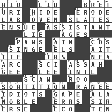ACROSS 1. To free from 4. Hat (slang) 7. Cy Young winner Saberhagen 11. RI univ. 12. Flintstone garb 13. Eat (away) 14. Experiment locale 15. Baking chamber 16. Chalkboards 17. Follow as a consequence or result 19. Helper 21. Untruth 23. Grows older 24. Baking dishes 25. The 18th letter of the Arabic alphabet 26. Music discs 29. Scorch 30. Raised railways 31. Small island 32. Make a knot 33. Big collection agency 34. Teachers' org. 35. Curve 36. _-fi 37. Indian state 40. Turn to the right 41. Area sheltered from the wind 42. International (abbr.) 43. Examine minutely or intensely 45. Friend of Pooh 46. Casting lots 51. Indian princess (variant) 55. Foolish or stupid persons 56. Yawn 58. According to 59. Impressive in appearance 60. Blunders 61. Title for a knight 62. Celtic language 63. Environmental prefix 64. "___ Little Indians" DOWN 1. Governing power 2. SW Asia republic 3. Rights 4. 54 in ancient Rome 5. The main thing one is thinking about 6. Hiding places for outlaws 7. Naughty children 8. Round or rotation of duties 9. Genesis locale 10. Trial 12. Weeding 13. Otherwise 16. Attaches a signature 18. Uhlan (variant) 20. Travel by water 22. Compass dir. 24. Component 25. Nest on high 26. Lessep's creation 27. South Vietnam president (1954) 28. R.R. building 29. Father 32. Label 33. Ancient Celtic tribe of eastern Britain 36. Narrow boards 37. Atmosphere 38. Sounds asleep 39. Portico 43. Took without asking 44. Quote 46. Trig term 47. Scent 48. Chest bones 49. Double curve, resembling the letter S 50. Drug cop 52. Political cartoonist Thomas 53. Writer Wiesel 54. Merit 57. Adept person