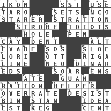 ACROSS 1. Visual representation of an object 5. Fast jet (abbr.) 8. Purpose 11. Pacific island yam 12. Puts into a specified state 13. Non-commissioned officer (abbr.) 14. A viewer who gazes fixedly 17. Ski resort town in Vermont 19. Disco prop 21. Foolish or stupid persons 22. Opening into or through something 23. Animal enclosure 24. Island 27. Scratch 29. The first octave above the treble staff 32. Elude 34. Mayday 36. A type of plum 37. Australian parrot (variant) 38. Baseball player Mel 39. Capital of Latvia 40. Actor's bit 41. Modern: prefix 42. Middle Eastern gold or silver currency 43. Begley and Asner 44. Fly high 46. Followers of ems 47. Had dinner 50. Island territory of the United States 52. Food allowance for one day 55. Assistant 57. Make much ado about nothing 59. Cease 62. Storage container 63. Comedian Laurel of Laurel & Hardy 64. The content of cognition 65. Eastern Standard Time (abbr.) 66. Cask 67. Penny DOWN 1. ___ a Wonderful Life 2. Krazy ___ of comics 3. Mouths or openings 4. _ pole 5. Arrange properly for use 6. Remove all contents or possession from 7. Sadhe (variant) 8. To (old English) 9. Native of Scotland 10. Immeasurably long periods of time 12. Compass dir. 15. Eat (away) 16. Hero or heavy, e.g. 18. Shallow baking pan 20. Gillaume's butler role 24. Cell (Danish) 25. Prevent the occurrence of 26. Entertaining tales 28. Hauls 29. Place in a line 30. Utah city north of Ogden 31. Lacerates 33. Expire 35. Moe Howard, for one 36. _ Lanka 42. Window treatment 45. Old (Scot.) 47. Atmosphere 48. Cod relative 49. Maternal 51. Mesonic 52. Loose flowing garment 53. Deliberation 54. Portable shelter 55. Layer 56. Travel on an animal 58. Label 60. Elected rep. 61. Make lace
