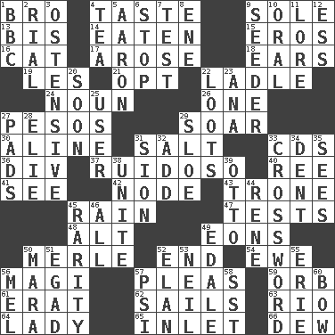 ACROSS 1. Sis' sibling 4. Clothes sense 9. Not divided or shared with others 13. Altar cloth linen 14. Eroded 15. Greek god of love 16. Domesticated feline 17. Came up 18. Hearing organs 19. French article 21. Choose 22. Dipping utensil 24. Part of speech 26. Single 27. Mexican monetary units 29. Fly high 30. Place in a line 31. Table seasoning 33. Music discs 36. HTML Container Element 37. Boisterous (Brazilian Portuguese) 40. Portuguese money of account (variant) 41. Observe 42. Thickened enlargement 43. Heavy duty weighing machine 45. Water falling in drops from the sky 47. Trials 48. Keyboard modifier key 49. Immeasurably long periods of time 50. Haggard of country music 52. Conclusion 54. She-sheep 56. Wise men 57. Entreaties 59. Globe 61. Part of Q.E.F. 62. Moves on water 63. _ de Janeiro 64. Kenny Rogers chart-topper in '80 65. An arm off of a larger body of water 66. Morning condensation DOWN 1. English channel? 2. Monetary unit of Yemen 3. Clearly or manifestly demonstrative 4. Beverage made from leaves 5. Composer Copland 6. Halt 7. Trial 8. Compass dir. 9. Sowing specialist 10. Taken by mouth 11. Old wives' tales, e.g. 12. Double-curved letter 20. Within a short period 22. Plunders 23. Santa ___, CA 25. One who uses or employs something 27. Writing tablets 28. Writer Wiesel 29. _ gin 31. The Jewish people; Israel 32. Increase 33. What you're doing now 34. Incision 35. Perceives with the eye 38. Join together 39. "Beetle Bailey" pooch 44. French philosopher Descartes 45. Noteworthy scarcity 46. 100% 49. Peak District village in England 50. Hindu Mythology: god of death 51. Mild oath 52. Flair 53. Famous astronaut Armstrong 55. 4th largest of the Great Lakes 56. Cartoonist voice _ Blanc 57. Air pressure measure (abbr.) 58. Fast jet (abbr.) 60. Ribbon knot