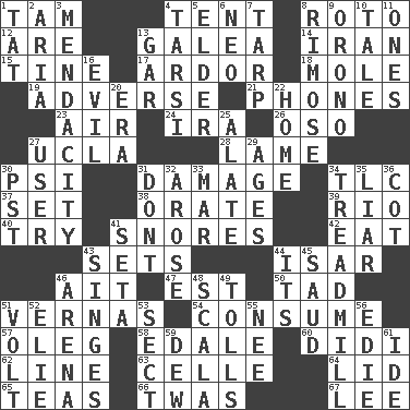 ACROSS 1. Scottish cap 4. Portable shelter 8. Printing process, for short 12. "We ___ not amused" (Victoria) 13. An organ shaped like a helmet 14. SW Asia republic 15. Prong on a fork 17. Zeal 18. Undercover agent 19. Contrary to your interests or welfare 21. Gives a jingle 23. Atmosphere 24. Lyricist Gershwin 26. Bear (Spanish) 27. Southern CA. univ. 28. Unable to walk 30. Air pressure measure (abbr.) 31. Break 34. Affectionate concern, for short 37. Arrange properly for use 38. Speak pompously 39. River (Sp.) 40. Attempt to accomplish something 41. Sounds asleep 42. Ingest 43. Puts into a specified state 44. Austrian river, tributary to the Danube 46. Small island 47. Eastern Standard Time (abbr.) 50. Small amount or degree 51. Actresses Bloom and Felton 54. Eat 57. Cassini of fashion 58. Peak District village in England 60. "You Light Up My Life" star Conn 62. Actor's bit 63. Cell (Danish) 64. Flaplike covering 65. Beverages made from leaves 66. It was, poetically 67. Area sheltered from the wind DOWN 1. Make lace 2. Operatic vocal solo 3. Ananias' fault 4. Tarsus (plural) 5. A person who is older than you are 6. Modern: prefix 7. Canvas cover 8. Full of chinks, cracks, or crevices 9. U. of Maine site 10. Falsehood 11. Washington bills 13. Slender fish 16. Morally bad or wrong 20. Period 22. Dwelling 25. Having winglike extensions 27. One who uses or employs something 29. Eras 30. Pacific Standard Time (abbr.) 31. Do not 32. Came up 33. Third mo. 34. Excercise machine 35. One who doesn't tell the truth 36. Small bed 41. Stalk of a moss capsule 43. Scorches 44. It is 45. Saudi Arabian king (1953-1964) 46. Sports stadium 48. Any of the three canals of the cochlea 49. For Whom the Bell _____ 51. Electrical Unit 52. Writer Wiesel 53. Religious group 55. Born 56. Singer Brickell 59. Morning condensation 61. Binary compound