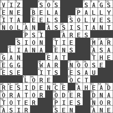 ACROSS 1. Namely 4. Mayday 7. Sinks 11. Compass dir. 12. Actor Lugosi 13. Chummy 14. Call ___ day 15. Snakelike fish 16. Finds the solution 17. Pitcher Ryan 19. Aide 21. 23rd letter of the Greek alphabet 23. Ancient Greek god of war 24. The Jewish people; Israel 25. Neckwear 26. Impair 29. Woody, climbing, usually tropical plant 30. Followers of ems 31. White ___ sheet 32. Separate the seeds from cotton 33. Ingest 34. Definite Article 35. Oval reproductive body of a fowl 36. Armed conflict 37. Trap for birds or small mammals 40. Compass dir. 41. It is 42. Son of Isaac 43. Old wives' tales, e.g. 45. Sep. follower 46. Home 51. Toward the future 55. Speaker 56. River in Europe 58. Heredity factor (abbr.) 59. Carrier 60. Sliced desserts 61. And not 62. SW Saudi Arabia district 63. Elected rep. 64. A saturated hydrocarbon DOWN 1. Distinctive style or manner 2. To the inside or interior of 3. Ardor 4. Observe 5. Rounded earthenware pot or jar 6. Backtalk 7. Table seasonings 8. Inventor's middle name 9. Small, secluded valley 10. System (abbr.) 12. Gillaume's butler role 13. Airs 16. Founders of families 18. Capital of Western Samoa 20. Virtuous person 22. _ tizzy (2 wds.) 24. Burn superficially 25. Lacerates 26. Taiwanese island in East China Sea 27. American tennis player Robert 28. Actress Charlotte 29. Straggles 32. Unit of force equal to gravity 33. Ingested 36. One who wires 37. Modern: prefix 38. Motion picture awards 39. Pledge 43. 61 cubic inches 44. Aroma 46. Roll call or roster of names 47. Greek god of love 48. Suttee (variant) 49. 911 reaches them 50. Singer Brickell 52. Pulitzer Prize-winning author Ferber 53. Soon (poet.) 54. Have the gumption 57. Car or cant ending