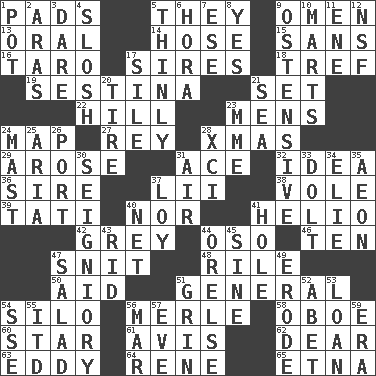 ACROSS 1. Groovy apts. 5. Those things 9. Sign of things to come 13. Spoken 14. Flexible conduit 15. Without 16. Pacific island yam 17. Titles for men of rank and authority 18. Not kosher 19. French poetic form 21. Arrange properly for use 22. Land elevation 23. Not women's 24. Atlas unit 27. Marina Del _, California 28. Dec. holiday 29. Came up 31. Adept person 32. The content of cognition 36. Title for a man of rank and authority 37. Cards in a Roman deck? 38. Short-tailed, large-bodied rat 39. Jacques of French films 40. And not 41. Sun: prefix 42. Jennifer or Joel 44. Bear (Spanish) 46. "___ Little Indians" 47. In a ____ (agitated or irritated) 48. Cause heat under the collar 50. Assist 51. Commissioned military rank 54. Grain storage tower 56. Haggard of country music 58. Mitch Miller's instrument 60. Play the lead 61. Advice 62. Letter starter 63. Whirlpool 64. French philosopher Descartes 65. Inactive volcano in Sicily DOWN 1. Plant holder 2. Caspian sea tributary 3. Have the gumption 4. Splash clumsily 5. Without viscosity 6. Israeli folk dance 7. Compass dir. 8. Affirmative reply 9. Clearly or manifestly demonstrative 10. Shops 11. Compass dir. 12. Science/research agcy. 17. Filth; sediment 20. Become fatigued 21. Ocean 23. Madame (abbr.) 24. Vertical spar for supporting sails 25. Operatic vocal solo 26. Left side of a ship or aircraft 28. One more than ninety 30. Signiory (variant) 31. Atmosphere 33. Dunce 34. Writer Wiesel 35. Period of immesurable duration 37. Myrna of the movies 40. Fish or hair follower 41. Hollow 43. To free from 44. Threatening words 45. Trig term 47. First course 49. Wear away 51. Smile widely 52. Collude with 53. Grant temporary use of 54. Compass dir. 55. It would 56. Make imperfect 57. First lady 59. Epoch
