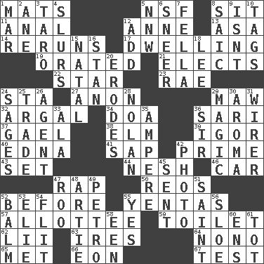 ACROSS 1. Floor coverings 5. Science/research agcy. 8. Be seated 11. Of or related to the anus 12. Queen of England 1702-14 13. White ___ sheet 14. Summer TV shows 17. Residence 19. Declaimed 21. Chooses 22. Play the lead 23. Actress Charlotte 24. R.R. building 27. At once, immediately (arch.) 29. Informal term for the mouth 32. Therefore, facetiously 34. ___ good deed 36. Indian skirt 37. Highlander 38. Shade tree 39. Composer Stravinsky 40. Pulitzer Prize-winning author Ferber 41. Plant excrement 42. First class 43. Put into a specified state 44. Tender 46. Automobile 47. Reproach for some lapse or misdeed 50. Vintage cars 52. Prior to 55. Gossips 57. One to whom something is allotted 59. Bathroom plumbing fixture 62. Cards in a Roman deck? 63. Angers 64. Words to Nanette 65. Was introduced to 66. A really long time 67. Trial DOWN 1. Impair 2. One (Scot) 3. Edible starchy tuberous root 4. Plays smoothly or legato 5. Compass dir. 6. Scornful expression 7. Chap (slang) 8. Ketch in the Levant 9. Is not 10. Labels 12. Increase 15. Brizilian seaport 16. Comedian Laurel of Laurel & Hardy 18. Area sheltered from the wind 20. Eats (away) 24. Gurus 25. Buy and sell 26. Rep 28. Pitcher Ryan 29. Mysterious quality of enchantment 30. Odor 31. One who wires 33. According to 35. Electrical Unit 36. Title for a knight 42. Picture 45. Posted 47. Friend of Pooh 48. Nick name for Arthur 49. Stone: prefix 51. Virtuous person 52. Lip ointment 53. Writer Wiesel 54. Sudden quick movement 55. Affirmative reply 56. _ gin 58. Car or cant ending 60. Followers of ems 61. Small child