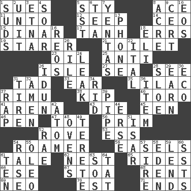 ACROSS 1. Takes to court 5. Filthy place 8. Adept person 11. To (old English) 12. Ooze 14. Corporate head (abbr.) 15. Middle Eastern gold or silver currency 17. Hyperbolic tangent 18. Blunders 19. A viewer who gazes fixedly 21. Rest room 23. Petroleum 25. Against 26. Small island 27. Ocean 28. Perceive with the eye 31. Bit 33. Hearing organ 35. Pale purple color 37. Tall New Zealand timber tree 38. Sleep 40. "Corrida" creature 41. Sports stadium 43. Pass on 45. Car or cant ending 46. Writing instrument 47. Small child 50. Demure 52. Be footloose 53. Curvy letter 54. Wanderer 56. Artist's stands 61. Story 62. A home for chicks 65. Amusement-park features 66. Compass dir. 67. Portico 68. Monthly bill 69. Modern: prefix 70. Eastern Standard Time (abbr.) 71. Conclusions DOWN 1. Beer foam 2. A single undivided whole 3. Inactive volcano in Sicily 4. Fly high 5. Fast jet (abbr.) 6. Beverage made from leaves 7. Gossips 8. Land measure 9. Foregone conclusion 10. Greek goddess of the dawn 13. Give a jingle 16. Vintage cars 18. Biblical high priest 20. Cause heat under the collar 22. Slanted text style (abbr.) 24. Path through which fluid escapes 26. Goddess of spring and wife of Bragi 28. _ gin 29. Merit 30. Environmental prefix 31. Become fatigued 32. So be it 34. To free from 36. A distinct part 37. Reproach for some lapse or misdeed 39. Corncob 42. Tiny particle 44. Celtic language 48. Baking chambers 49. Cigar-shaped 51. Austrian river, tributary to the Danube 52. Actress Charlotte 54. Raze (variant) 55. Margarine 57. Title for a man of rank and authority 58. Paradise 59. Grant temporary use of 60. Fast planes 61. "___ Little Indians" 63. Mayday 64. Make lace