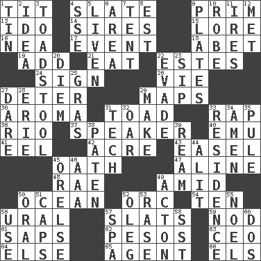 ACROSS 1. Teat (slang) 4. Schedule 9. Demure 13. Wedding promise 14. Male parents of animals 15. Old wives' tales, e.g. 16. Teachers' org. 17. Incident 18. Collude with 19. Say or write further 21. Ingest 22. _____ Park, CO 24. Signal 26. Compete 27. Prevent from occurring 29. Atlas contents 30. Scent 31. Frog relative 33. Hit sharply and swiftly 36. River (Sp.) 37. Orator 40. Australian flightless bird 41. Snakelike fish 42. Land measure 43. Artist's stand 45. Pledge 47. Place in a line 48. Actress Charlotte 49. Among 50. Sea 52. The grampus (Milton) 54. "___ Little Indians" 56. Mountain range 57. Narrow boards 59. Lower and raise head in agreement 61. Plant excrements 62. Mexican monetary units 63. Corporate head (abbr.) 64. Otherwise 65. Representative 66. Raised railways DOWN 1. Metal container 2. The main thing one is thinking about 3. Inedible or poisonous agaric 4. Compass dir. 5. Make or become more lively 6. Length times width 7. Portable shelter 8. Eastern Standard Time (abbr.) 9. Food holders 10. Loose flowing garment 11. Angers 12. Was introduced to 20. South Vietnam president (1954) 22. Elude 23. Small drink 25. Pate de foie ____ 27. Have the gumption 28. One of the Great Lakes 29. Cause to be 31. Technical 32. Rowing implement 33. Dwelling 34. So be it 35. Whine 38. Eucharist need 39. 480, 500 or 516 sheets of paper 44. Set down 45. Threatening words 46. American Automobile Association (abbr.) 49. NE Massachussets city 50. Spoken 51. Balmoral and tarboosh 52. Cassini of fashion 53. To erase 55. Christmas carol 56. Purpose 57. Health resort 58. Fast jet (abbr.) 60. Two (Sp.)