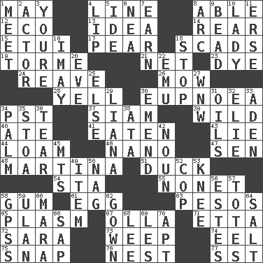 ACROSS 1. Fifth month 4. Actor's bit 8. Competent 12. Environmental prefix 13. The content of cognition 14. Buttocks 15. Needle holder 17. Lightbulb-shaped fruit 18. Large numbers or amounts 19. Singer Mel 21. Fish or hair follower 23. Color 24. Rob, plunder, or pillage 26. Cut the grass 28. Shout 30. Normal relaxed breathing 34. Pacific Standard Time (abbr.) 37. Thailand, formerly 39. Uncontrolled 40. Had dinner 41. Eroded 43. Falsehood 44. Rich soil 46. Billionth: prefix 47. Elected rep. 48. Chrissie's court nemesis 51. Evade 54. R.R. building 55. Music written for nine 58. Chewing product 61. Oval reproductive body of a fowl 63. Mexican monetary units 65. Suffix with ecto or cyto 67. Spanish pot 71. Singer James 72. "Two Mules for Sister ____" 73. Shed a tear 74. Snakelike fish 75. Fastener 76. Egg locale 77. Fast jet (abbr.) DOWN 1. Rendezvous 2. Thespian 3. You are 4. Mouth edge 5. Binary compound 6. Teachers' org. 7. Merit 8. Curve 9. Necklace unit 10. Kenny Rogers chart-topper in '80 11. Celtic language 16. "If ____ say so..." 18. Close up, plug up 20. Night before a holiday 22. Australian flightless bird 25. Otherwise 27. Compass dir. 29. Climbing, woody, usually tropical vines 30. Make improvements or corrections to 31. Petroleums 32. Writer Wiesel 33. Arabian gulf 34. Inside of hand 35. Portico 36. Pull into pieces 38. "One Day ___ Time" 42. Part of speech 45. Mountains (abbr.) 49. A distinct part 50. Tired old horse 52. Police officer (slang) 53. Leg joint 56. _____ Park, CO 57. Lugs 58. Global Positioning Systems (abbr.) 59. ____ Bator 60. Hindu Mythology: god of death 62. Bride's dress 64. Table seasoning 66. Plant excrement 68. Area sheltered from the wind 69. French article 70. Fitting