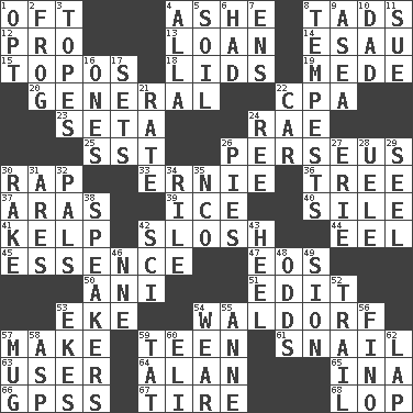 ACROSS 1. Often (poetically) 4. American tennis player Robert 8. Bits 12. Adept person 13. Grant temporary use of 14. He sold his birthright 15. Literary convention 18. Hats (slang) 19. Ancient Persian 20. Commissioned military rank 22. Tax preparer (abbr.) 23. Stalk of a moss capsule 24. Actress Charlotte 25. Fast jet (abbr.) 26. Son of Zeus who helped slay Medusa 30. Hit sharply and swiftly 33. Bert's buddy 36. Woody plant 37. Caspian sea tributary 39. Frozen water 40. Drop; flow; fall 41. Seaweed 42. Make a splashing sound 44. Snakelike fish 45. Gist 47. Greek goddess of the dawn 50. Cuckoo 51. Prepare for publication 53. Make supply last 54. Apple salad 57. Cause to be 59. Adolescent 61. Slow-paced one 63. One who makes use of a thing 64. Actor Alda or Thicke 65. _ tizzy (2 wds.) 66. Global Positioning Systems (abbr.) 67. Become fatigued 68. Trim (branches) DOWN 1. Choose 2. Tree-dwelling hopper 3. Drinks excessively 4. Silent film actress Nazimova 5. Earth 6. Possessed 7. Followers of ems 8. Storms 9. At sea 10. Male parent 11. Take to court 16. Singles 17. Puts into a specified state 21. Assign a rank or rating to 22. Auto 24. To sift 26. Sliced desserts 27. 4th largest of the Great Lakes 28. Ubangi River tributary 29. Stitch closed the eyes of (a falcon) 30. Libertine 31. Ancient Greek god of war 32. Friends 34. Cause heat under the collar 35. Non-commissioned officer (abbr.) 38. Orators 42. _-fi 43. The bottom of a shoe or boot 46. Compass dir. 48. Probability 49. The Jewish people; Israel 52. Hang back 53. Supplements with great effort 54. Erode 55. Queen of England 1702-14 56. A pale, very dry sherry 57. Java container 58. Viper 59. Make lace 60. Biblical high priest 62. Pet locale