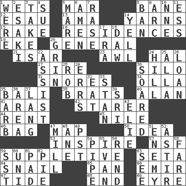 ACROSS 1. Soaks 5. Make imperfect 8. Object of repulsion 12. He sold his birthright 13. Housemaid (var.) 14. Entertaining tales 15. Immoral or dissolute person 16. Homes 19. Make supply last 20. Commissioned military rank 21. Austrian river, tributary to the Danube 23. Leather borer 24. Actor Linden 27. Male parent of an animal 30. Grain storage tower 31. Sounds asleep 34. Water jar 35. Indonesian resort city 38. Naughty children 40. Actor Alda or Thicke 41. Caspian sea tributary 42. A viewer who gazes fixedly 44. Monthly bill 45. "Death on the ____" 46. Paper or plastic container 47. Atlas unit 50. The content of cognition 53. Heighten or intensify 57. Overdraft (abbr.) 59. Supplying deficiencies 63. Stalk of a moss capsule 64. Slow-paced one 65. Baking dish 66. Arab leader 67. Periodic rise and fall of the sea level 68. Conclusion 69. Jane of fiction DOWN 1. We are 2. 1973 Nobel Price Winner (Physics) Leo 3. Receives possession of 4. Take to court 5. Female horse 6. So be it 7. Raze (variant) 8. Forbid 9. Curve 10. Compass dir. 11. Curvy letter 14. Shout 17. Retirement account (abbr.) 18. Fool 20. Amused look 22. Help 24. Land elevation 25. Silent film actress Nazimova 26. Grant temporary use of 28. Director Reiner 29. Blunders 30. Flew 32. Erode 33. Comedian Laurel of Laurel & Hardy 35. Sharp remark 36. Length times width 37. Long (Scottish) 39. _ Lanka 43. Writer Wiesel 47. Place where flour is made 48. One (Scot) 49. Pacific Standard Time (abbr.) 51. Foe 52. Moving about 54. Corncob 55. _ the terrible 56. Tear apart 58. Conductor's collection 59. Fast jet (abbr.) 60. Single; one (prefix) 61. Writing tablet 62. Sliced dessert 63. Observe
